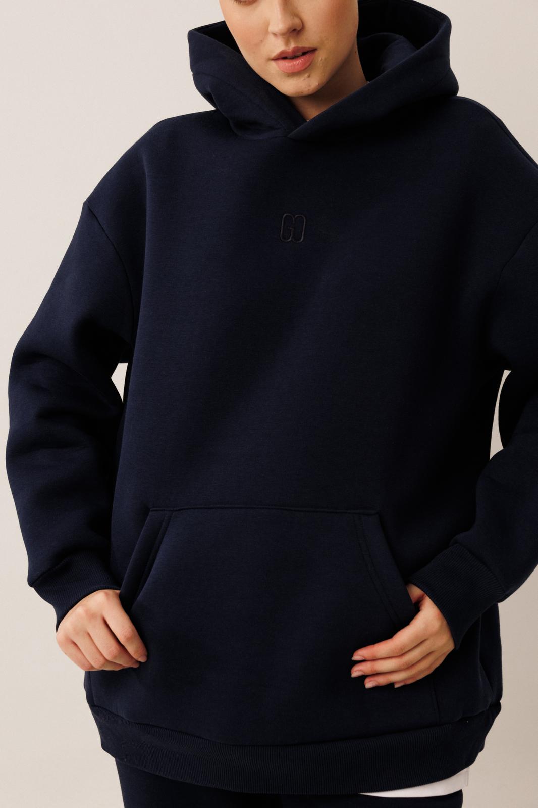 Худи имеет двойной капюшон и карман кенгуру. По центру переда вышивка-логотип в цвет ткани. Рукава имеют притачную манжету. Манжеты рукавов и низ изделия выполнены из ткани- компаньона кошкорсе.