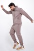 Состоит из джемпера и брюк. Джемпер классического мужского силуэта, с застежкой молнией по переду и воротником - стойкой. На переде имеются горизонтальные декоративные подрезы и удобные карманы, обработанные в наклонных швах. Вышивка - логотип в цвет ткани на левой стороне переда. Рукава втачные одношовные с притачной манжетой. Стойка, низ изделия и манжеты выполнены из ткани - компаньона кашкорсе. Вдоль молнии, по рельефным швам и по линии кармана проложены отделочные строчки. Брюки немного зауженные к низу с притачной манжетой. Пояс на резинке и со шнурком внутри. Пояс и манжеты выполнены из ткани компаньона - кашкорсе. Передняя половинка брюк с удобными боковыми карманами.
