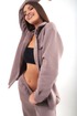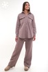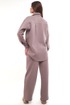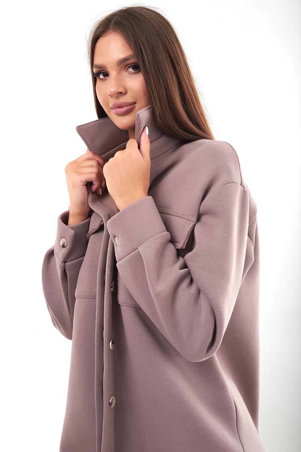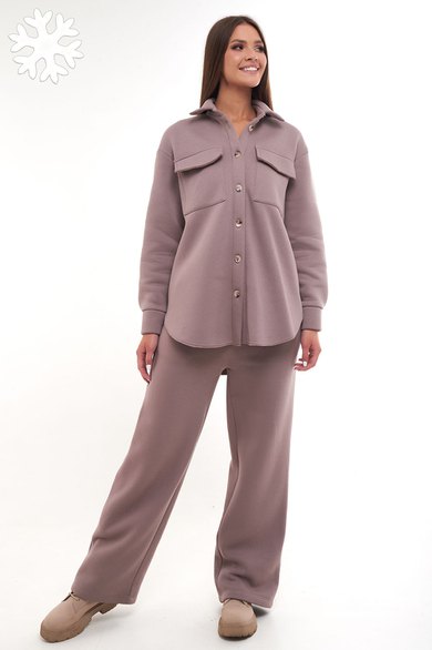 Современный женский костюм состоит из рубашки покроя оверсайз и прямых. Костюм изготовлен из футера с начесом. Рубашка с классическим рубашечным воротником с застежкой на петли и пуговицы. На передах накладные карманы с клапанами. Спинка с кокеткой и двумя складками из-под нее. Рукава длинные, имеют манжеты с застежкой на петлю и пуговицу. Низ изделия и клапаны имеют не обработанный край, но укреплен специальной строчкой. Брюки длинные, прямые. По передним половинкам функциональные карманы. Пояс из ткани кошкорсе, с резинкой и шнуром внутри.