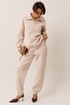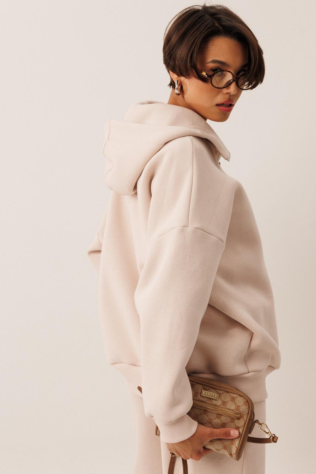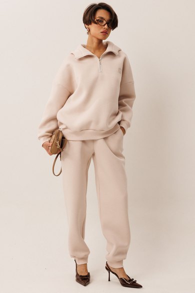 Женский тёплый уютный костюм. Подойдёт для прогулок и отдыха. Изготовлен из футера с начёсом, состоит из джемпера с капюшоном, покроя оверсайз и брюк. Джемпер имеет контрастную короткую застёжку- молнию по центру переда, которая переходит в капюшон. Капюшон двойной, внутренняя часть выполнена из кулирки. Слева на переде вышивка-логотип в цвет ткани. Рукава имеют притачную манжету. Манжеты рукавов и низ изделия выполнены из ткани- компаньона кошкорсе. Брюки немного зауженные, снизу с манжетой. Передние половинки имеют удобные карманы. Пояс с резинкой и шнурком внутри. Пояс и манжеты выполнены из кошкорсе.