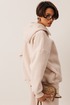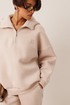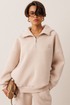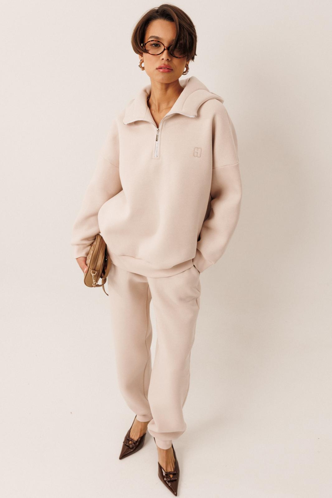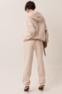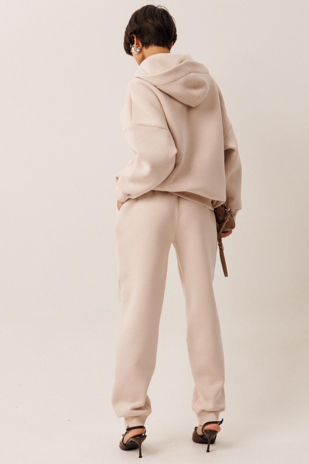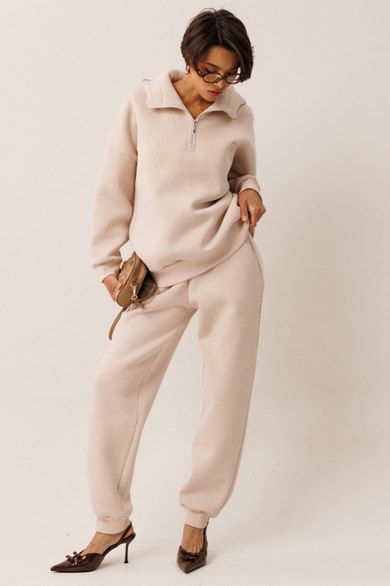 Женский тёплый уютный костюм. Подойдёт для прогулок и отдыха. Изготовлен из футера с начёсом, состоит из джемпера с капюшоном, покроя оверсайз и брюк. Джемпер имеет контрастную короткую застёжку- молнию по центру переда, которая переходит в капюшон. Капюшон двойной, внутренняя часть выполнена из кулирки. Слева на переде вышивка-логотип в цвет ткани. Рукава имеют притачную манжету. Манжеты рукавов и низ изделия выполнены из ткани- компаньона кошкорсе. Брюки немного зауженные, снизу с манжетой. Передние половинки имеют удобные карманы. Пояс с резинкой и шнурком внутри. Пояс и манжеты выполнены из кошкорсе.