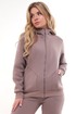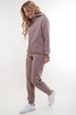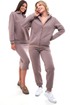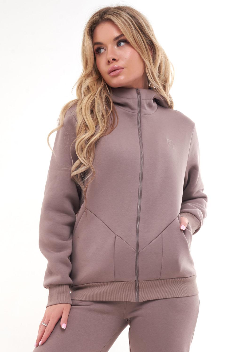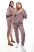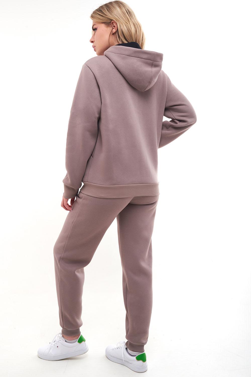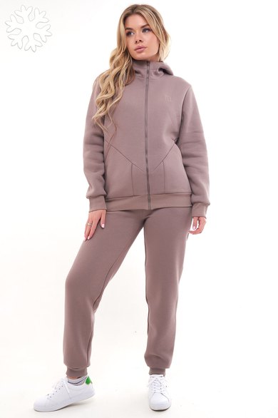 Женский тёплый уютный костюм. Подойдет для прогулок и отдыха. Изготовлен из футера с начесом, состоит из джемпера на молнии и брюк. Джемпер имеет застежку-молнию по центру переда и двойной капюшон. Внутренний капюшон выполнен из кулирки контрастного цвета. Перед имеет дизайнерские наклонные швы и удобные карманы. Слева на переде вышивка-логотип в цвет ткани. Рукава длинные, с притачной манжетой. Манжеты рукавов, стойка и низ изделия выполнены из ткани- компаньона кошкорсе. Брюки немного зауженные, снизу с манжетой. Передние половинки имеют удобные карманы. Пояс с резинкой и шнурком внутри. Пояс и манжеты выполнены из кошкорсе.