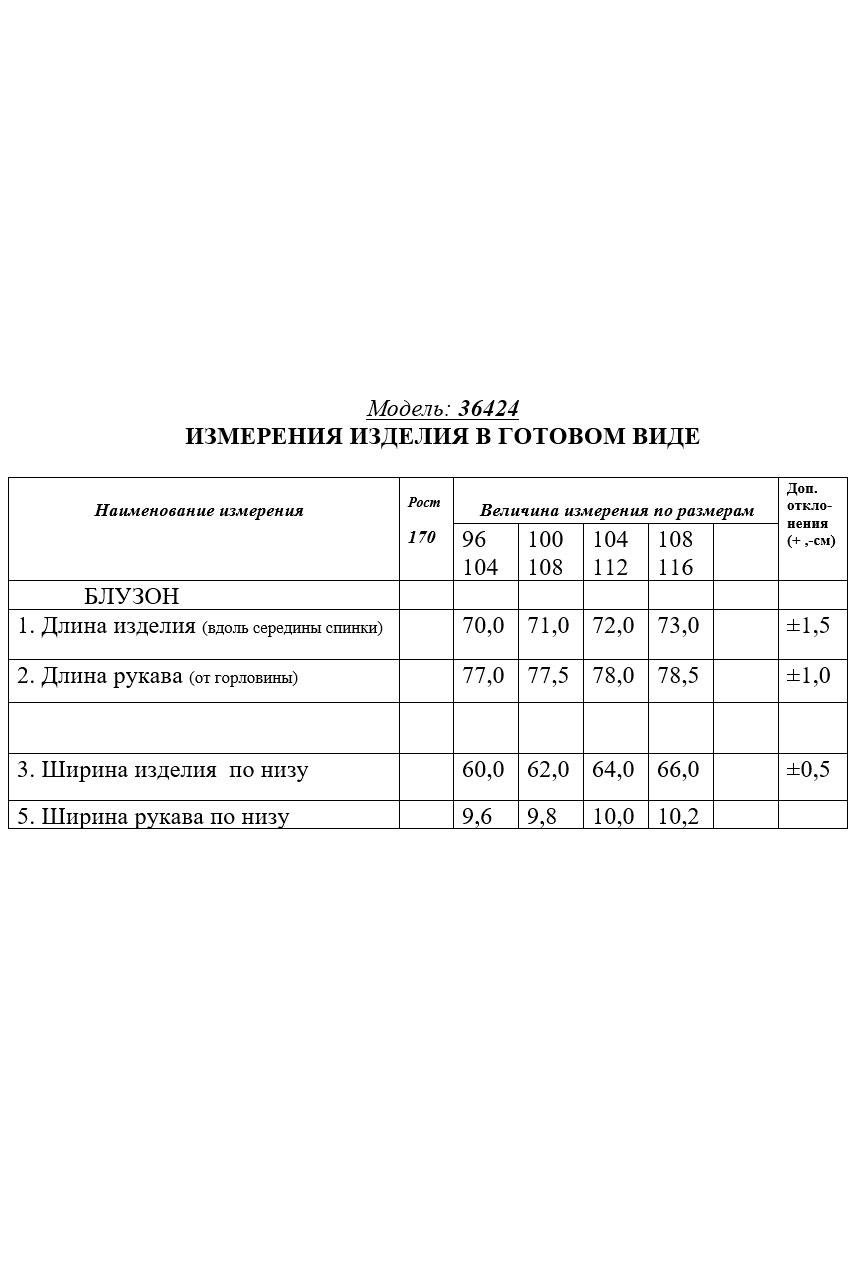 Блузон с втачным отложным воротником, без застежки. Рукав цельнокроенный , с отрезной длинной манжетой. Блузон без плечевых швов,по переду с горизонтальным швом. Спинка со средним швом, вытачками по низу. Низ блузона окантован.