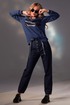Брюки с отрезным поясом, застежка-гульфик c застежкой на пуговицы, пояс застегивается на одну пуговицу. По передним половинкам- складки, закрепленные отделочной строчкой. В боковых швах расположены карманы. Вход в карман наклонный к боковому шву. На задних половинках- накладные карманы. По низу брюк- застрочены защипы. Пояс со шлевками.