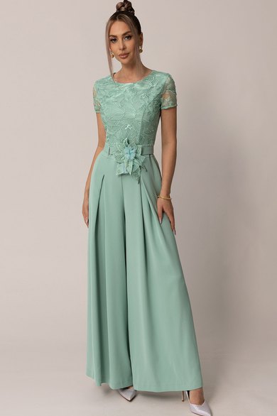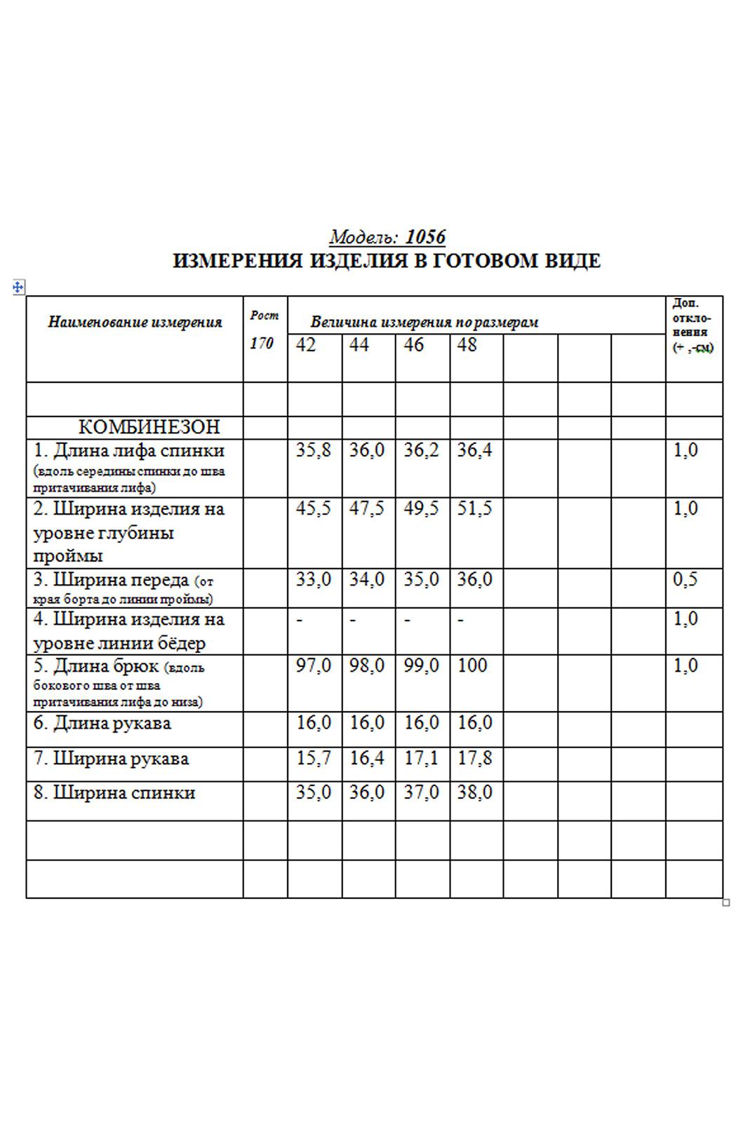 Комбинезон с круглым вырезом горловины, застежкой на потайную молнию в среднем шве спинки. Верх комбинезона по переду- двухслойный, с рельефами, выходящими из проймы. Верхняя часть спинки комбинезона со средним швом, рельефами, выходящими из проймы. Комбинезон с втачным поясом, шлевками, в которые продет съемный пояс с декоративной брошью.На передних половинках нижней части комбинезона расположены встречные складки. Задние половинки нижней части комбинезона с талиевыми вытачками.