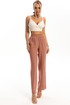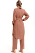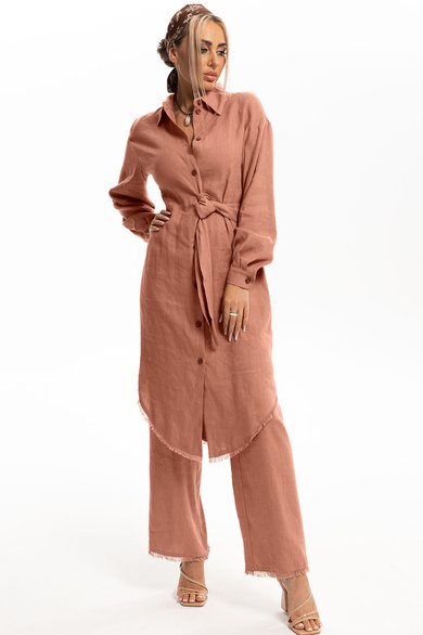 Туника с центральной застежкой на петли и пуговицы, втачным воротником с отрезной стойкой. Плечо спущенное, рукав втачной, длинный, с отрезной манжетой. Спинка с отрезной кокеткой, по шву притачивания кокетки- бантовая складка. На боковых швах расположены карманы для декоративного пояса. Пояс может фиксироваться в петле по борту правой полочки. Низ туники фигурный, с притачной деталью- бахромой. Брюки с отрезным поясом. Передние половинки с карманами, вход в карман наклонный к боковому шву. Пояс присборен на резинку. По низу брюк притачная деталь с бахромой. Силуэт: полуприлегающий, брюки- прямые.