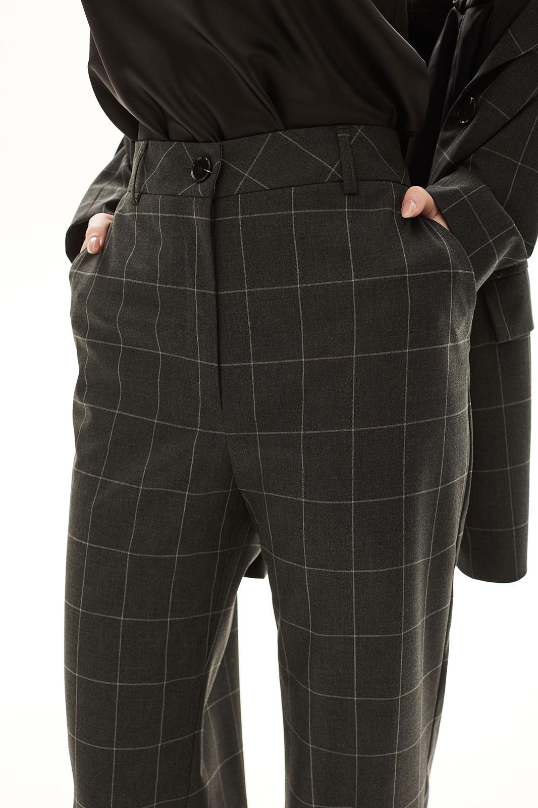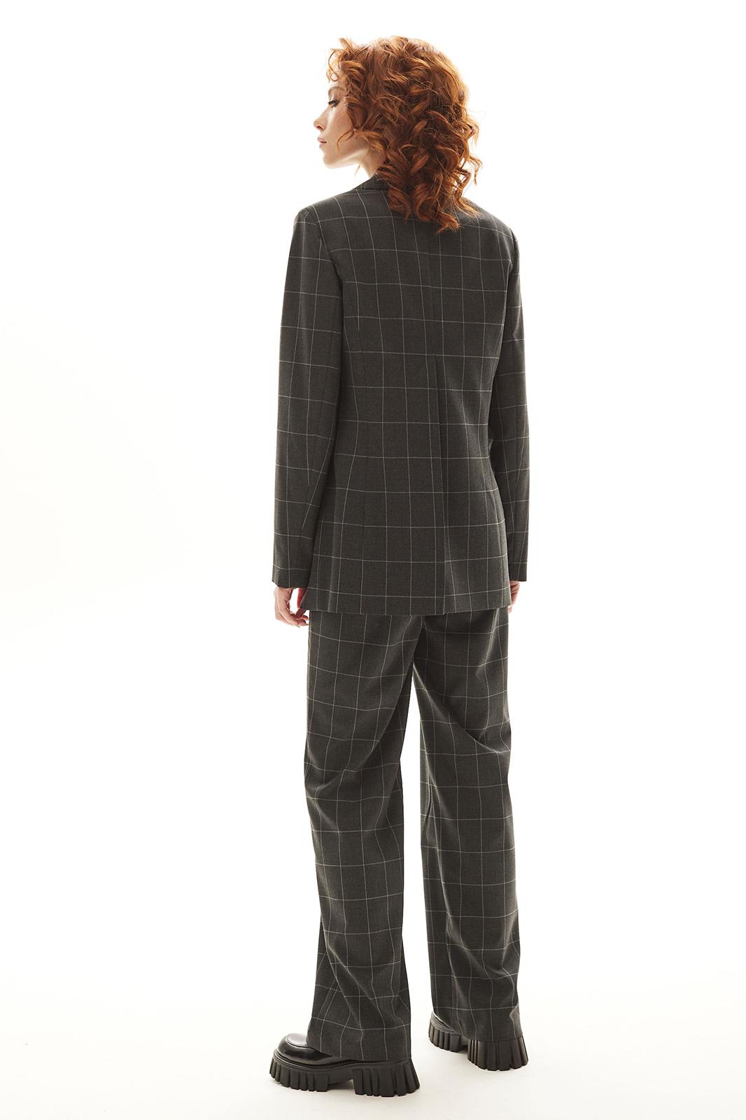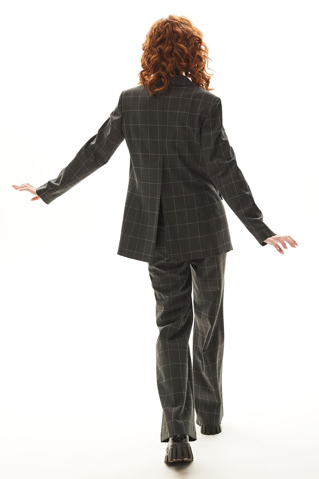 Костюм брючный. Жакет на подкладке прямого силуэта, с центральной застежкой на петли и пуговицы, отложным воротником и лацканами пиджачного типа. По переду с рельефами, выходящими из проймы, талиевыми вытачками, прорезными карманами с клапанами и двумя обтачками. Спинка со средним швом, заканчивающимся шлицей, рельефами, выходящими из проймы. Рукав втачной, длинный. Брюки с отрезным поясом. Передние половинки с карманами, вход в карман наклонный к боковому шву. Застежка гульфик.