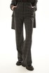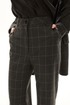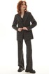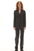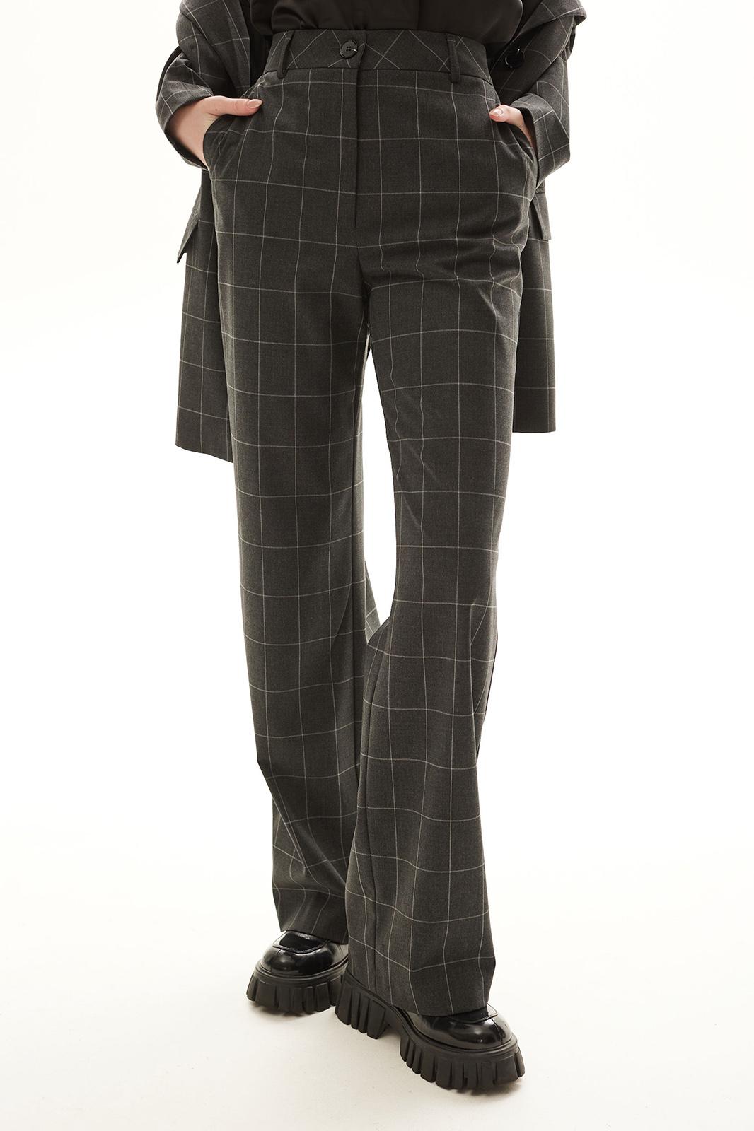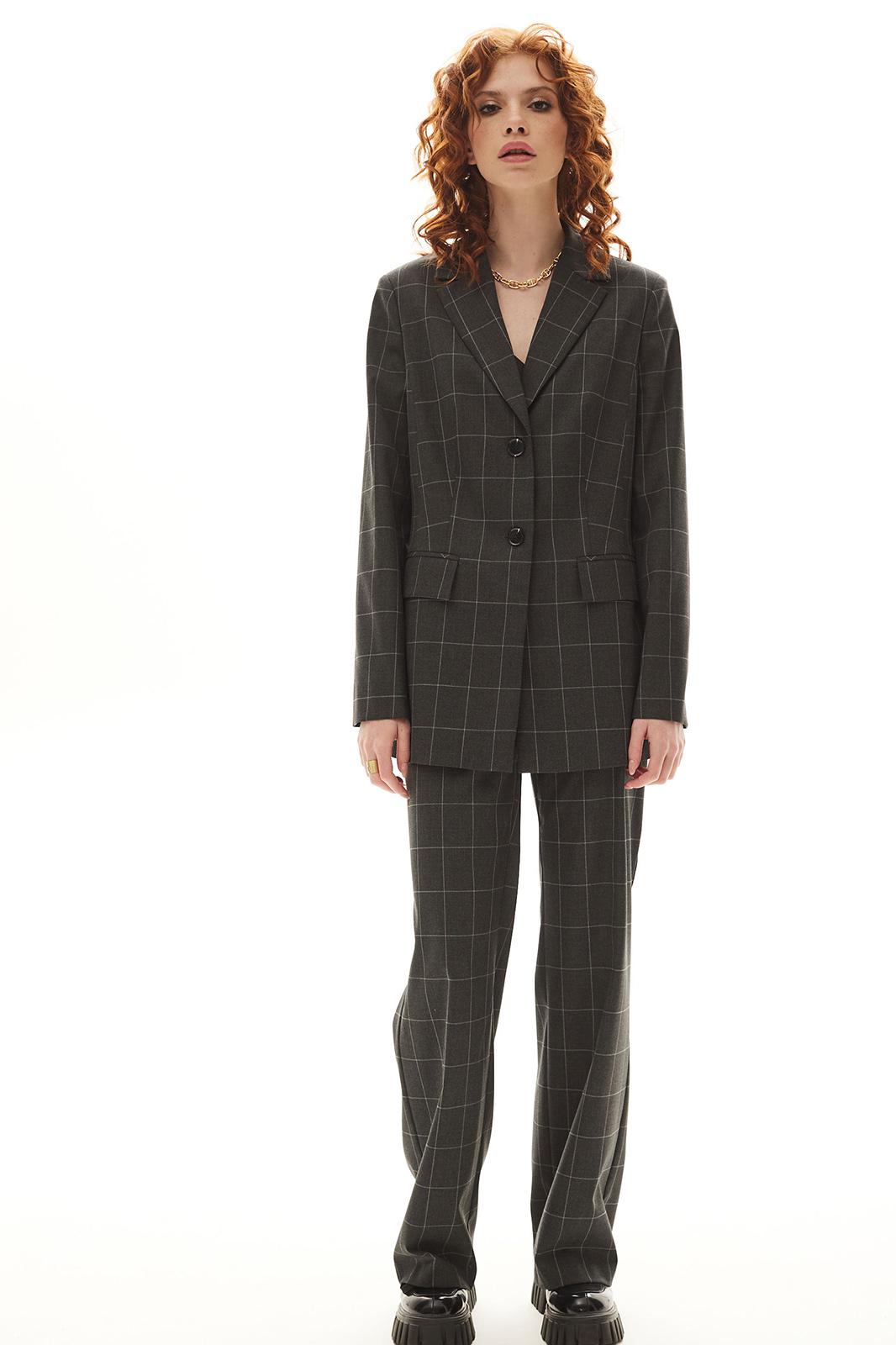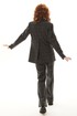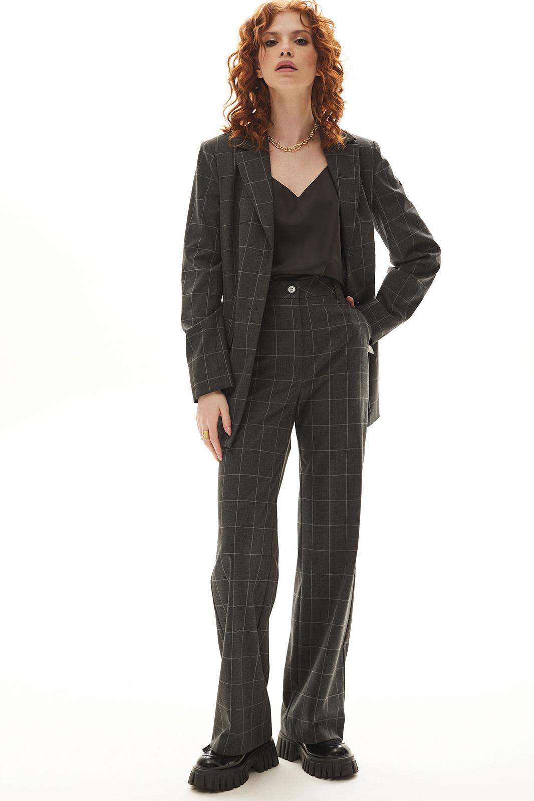 Костюм брючный. Жакет на подкладке прямого силуэта, с центральной застежкой на петли и пуговицы, отложным воротником и лацканами пиджачного типа. По переду с рельефами, выходящими из проймы, талиевыми вытачками, прорезными карманами с клапанами и двумя обтачками. Спинка со средним швом, заканчивающимся шлицей, рельефами, выходящими из проймы. Рукав втачной, длинный. Брюки с отрезным поясом. Передние половинки с карманами, вход в карман наклонный к боковому шву. Застежка гульфик.