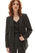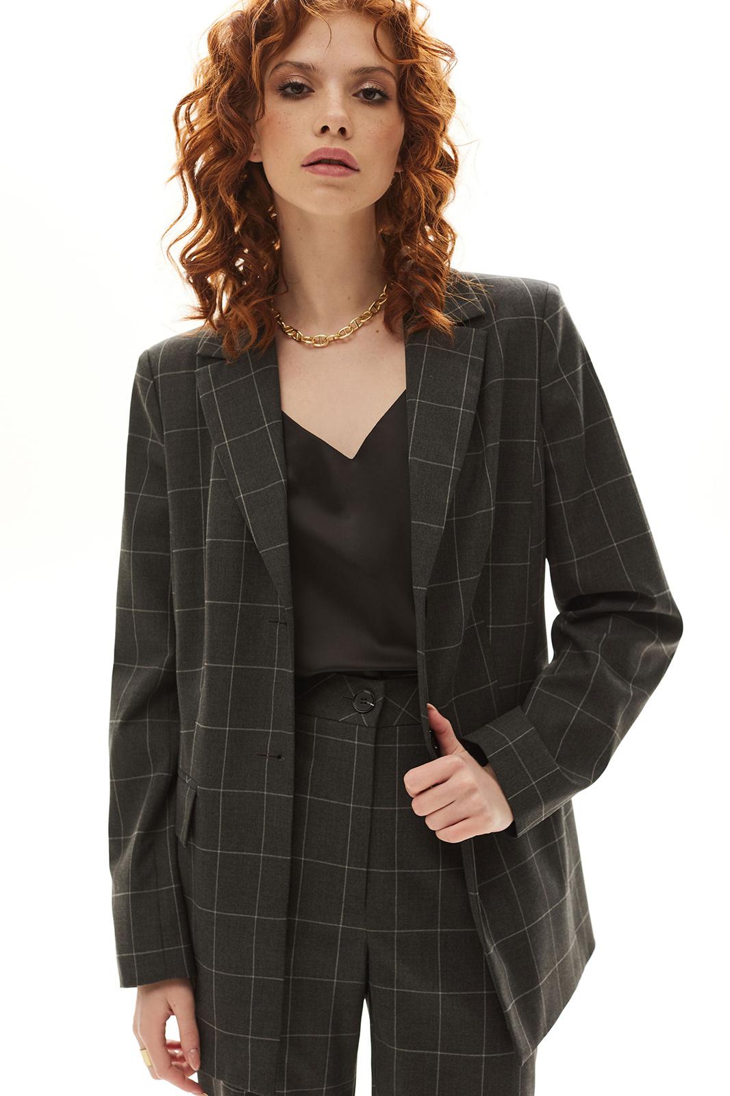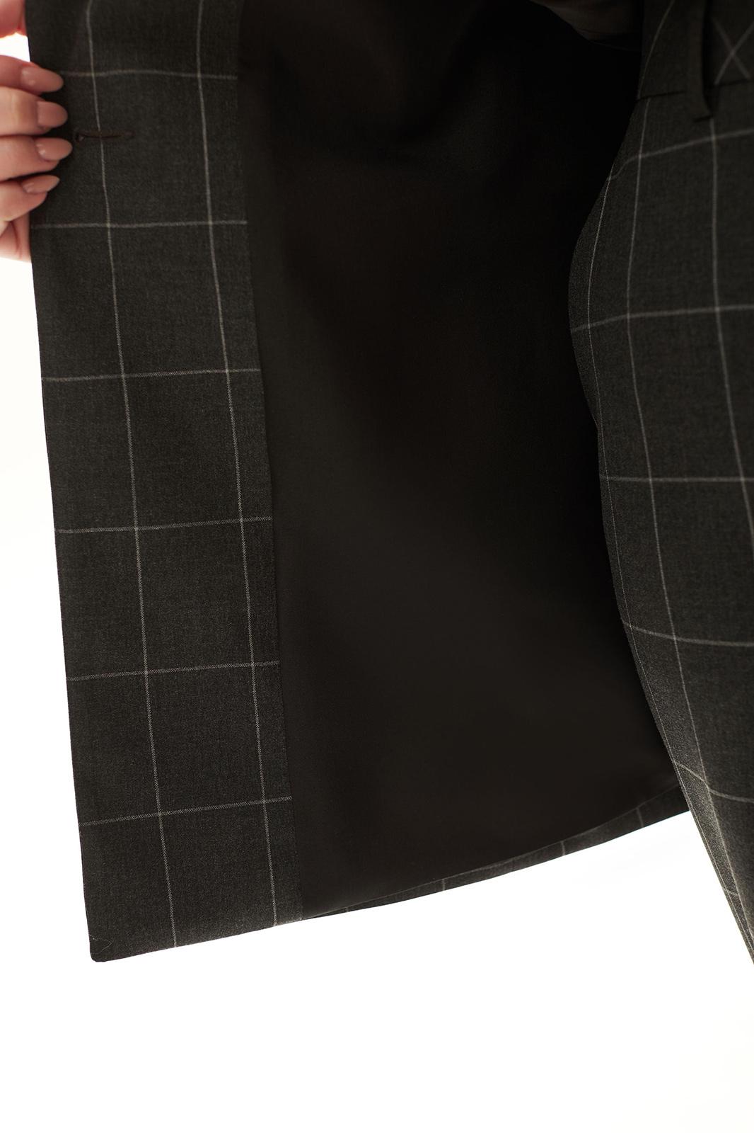 Цветовая гамма для верха, подкладки, фурнитуры, отделки: костюм выполнен из ткани с геометрическим рисунком.