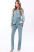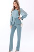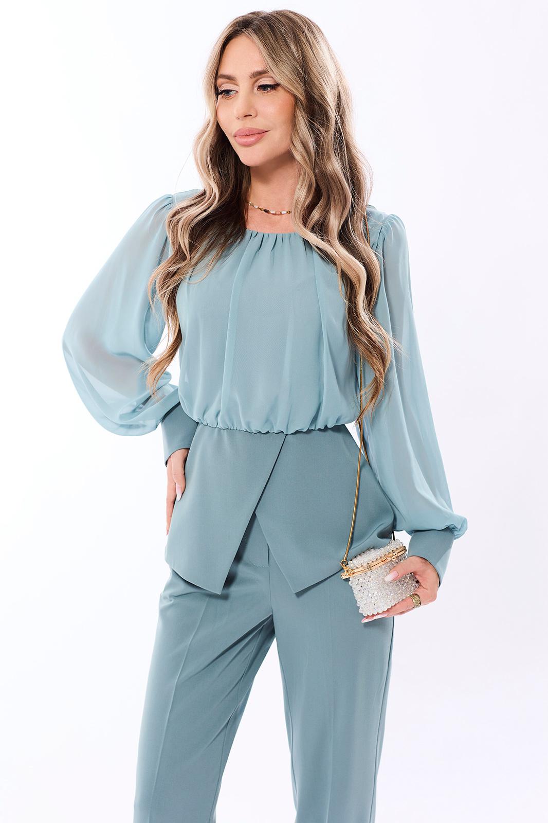 Комплектация: блузка и брюки. Блузка с застежкой на потайную молнию по среднему шву спинки, без воротника, с круглым вырезом горловины. По горловине переда- сборка. Блузка отрезная по линии талии, с баской. Баска переда состоит из двух фигурных деталей. Шов по талии со сборкой. Рукав втачной, длинный, с отрезной манжетой, застегивающейся на навесную петлю и пуговицу. Окат рукава и шов притачивания манжеты со сборкой. Брюки с отрезным поясом. В области спинки пояс присборен на резинку. Передние половинки с карманами. Вход в карман наклонный к боковому шву. Застежка- гульфик.