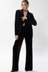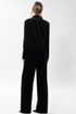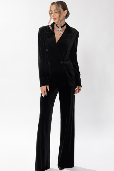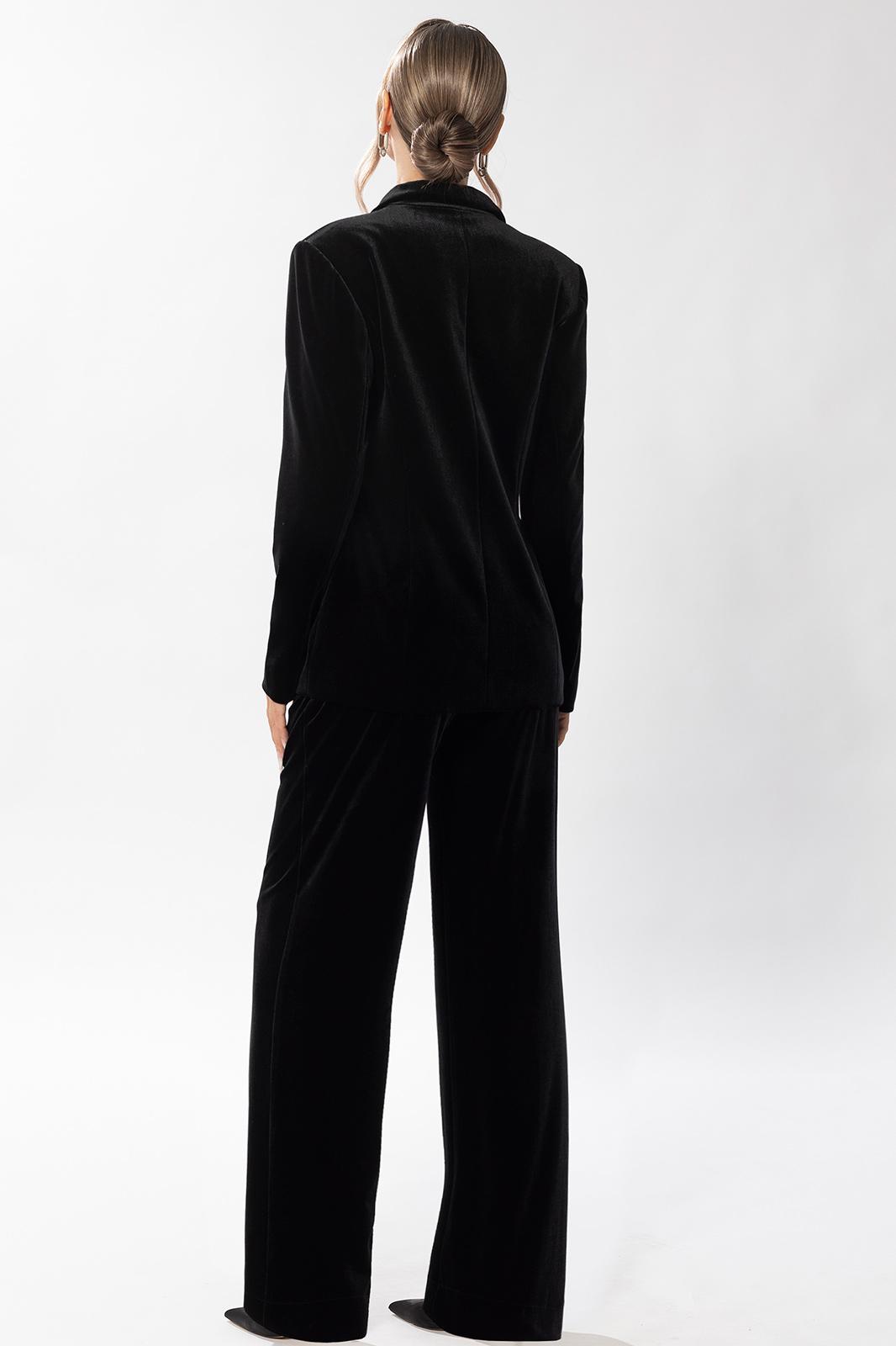 Комплектация: жакет и брюки. Жакет прямого силуэта с центральной двубортной застежкой на петли и пуговицы, с втачным воротником и отложными лацканами пиджачного типа. По переду с рельефами, выходящими из проймы. На уровне линии талии расположены настрочные клапаны. Спинка со средним швом, рельефами, выходящими из проймы. Рукав втачной, длинный. Брюки прямые, с отрезным поясом. По спинке и частично по переду пояс присборен на резинку.