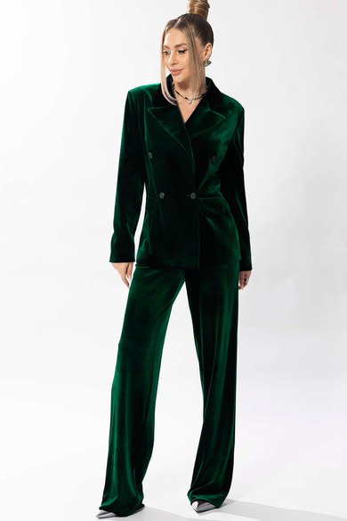 жакет прямого силуэта с центральной двубортной застежкой на петли и пуговицы, с втачным воротником и отложными лацканами пиджачного типа. По переду с рельефами, выходящими из проймы. На уровне линии талии расположены настрочные клапаны. Спинка со средним швом, рельефами, выходящими из проймы. Рукав втачной, длинный. Брюки прямые, с отрезным поясом. По спинке и частично по переду пояс присборен на резинку.