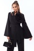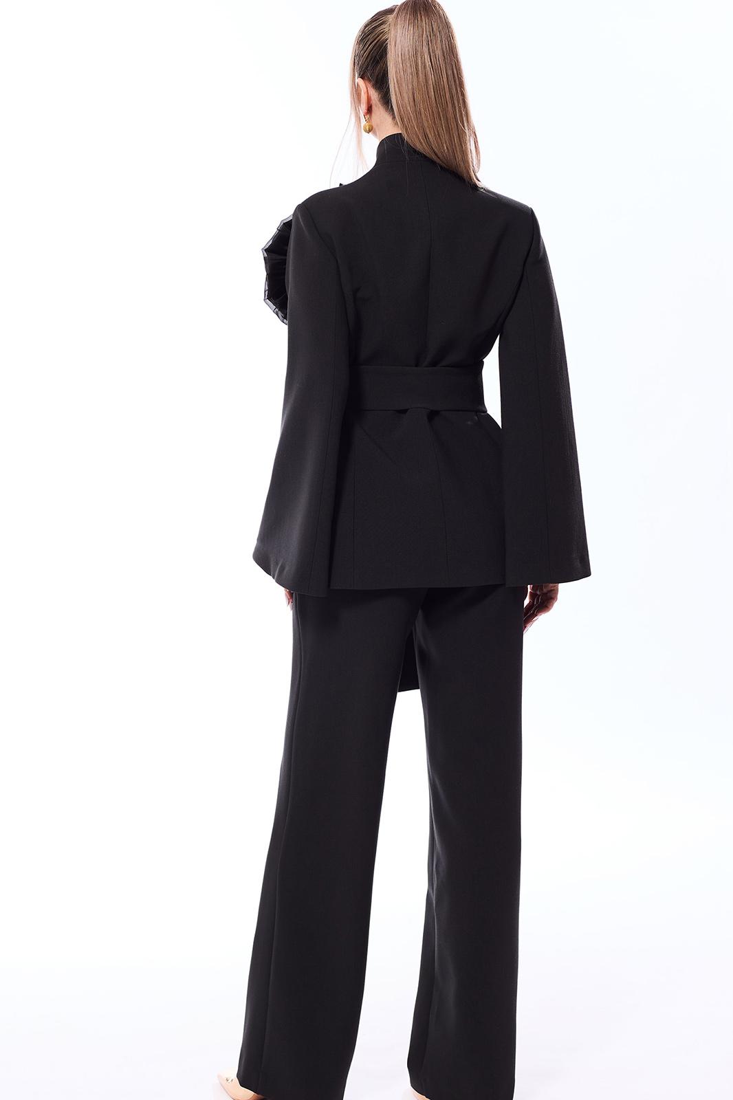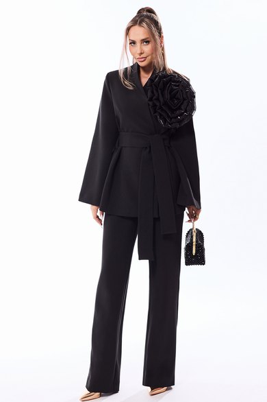 Комплектация: жакет на подкладке, брюки, съемное украшение. жакет свободного силуэта, с центральной двубортной застежкой на пришивные кнопки . Цельнокроеный воротник-стойка переходит в V-образный вырез горловины. По переду с выточками и полурельефами. Спинка со средним швом, рельефами, выходящими из проймы. Рукав втачной, длинный, расширенный к низу. Пояс широкий, съемный, из основной ткани. Брюки с отрезным поясом. В области спинки пояс присборен на резинку. Передние половинки с карманами, вход в карман наклонный к боковому шву. Застежка гульфик.