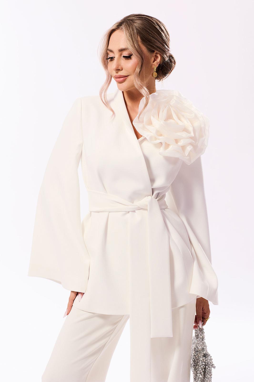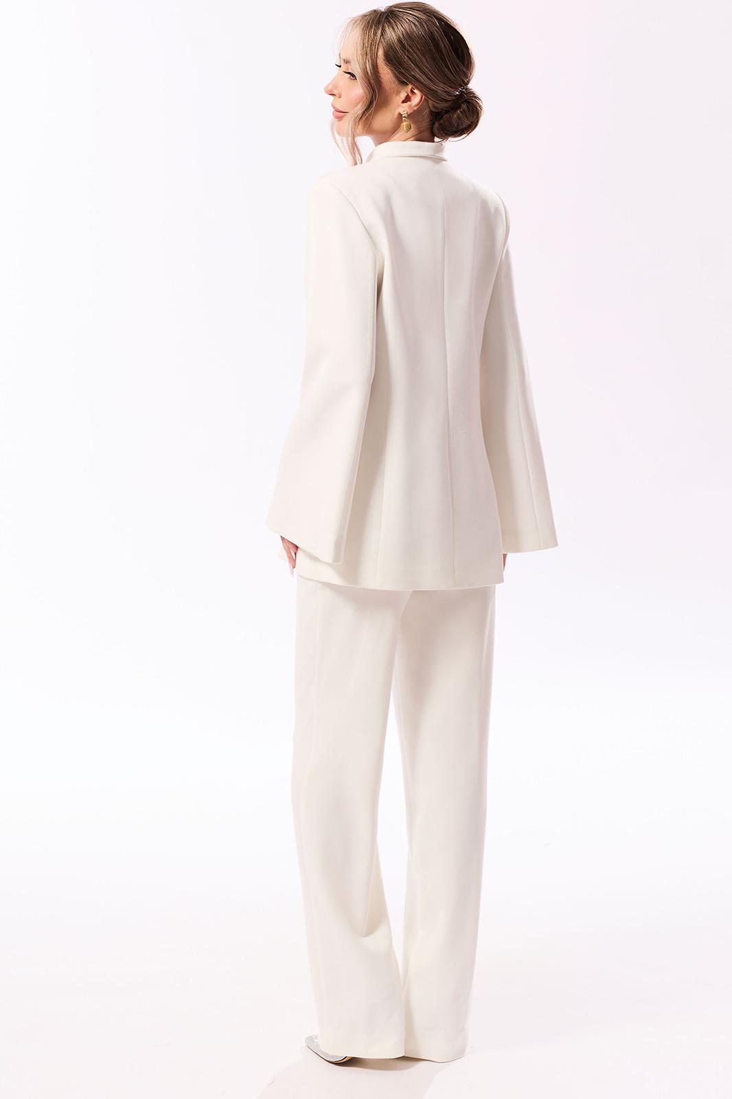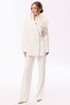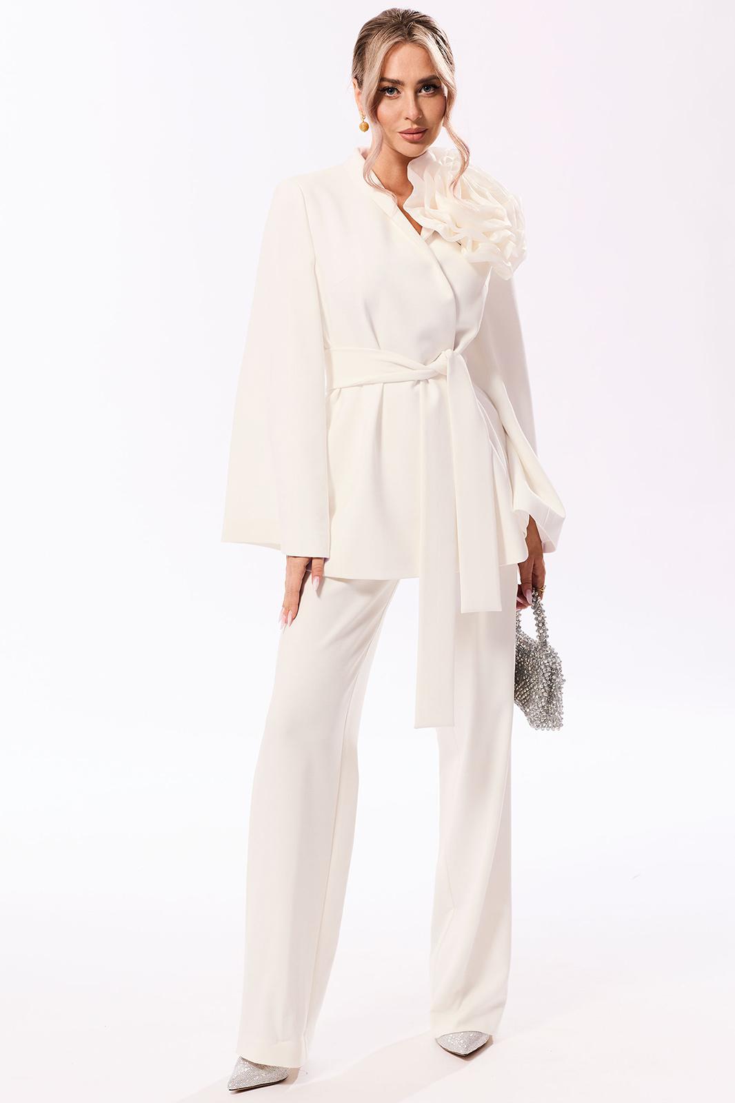 Комплектация: жакет на подкладке, брюки, съемное украшение. жакет свободного силуэта, с центральной двубортной застежкой на пришивные кнопки . Цельнокроеный воротник-стойка переходит в V-образный вырез горловины. По переду с выточками и полурельефами. Спинка со средним швом, рельефами, выходящими из проймы. Рукав втачной, длинный, расширенный к низу. Пояс широкий, съемный, из основной ткани. Брюки с отрезным поясом. В области спинки пояс присборен на резинку. Передние половинки с карманами, вход в карман наклонный к боковому шву. Застежка гульфик.