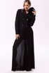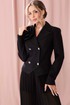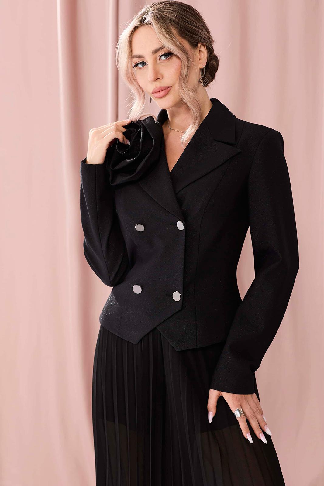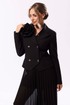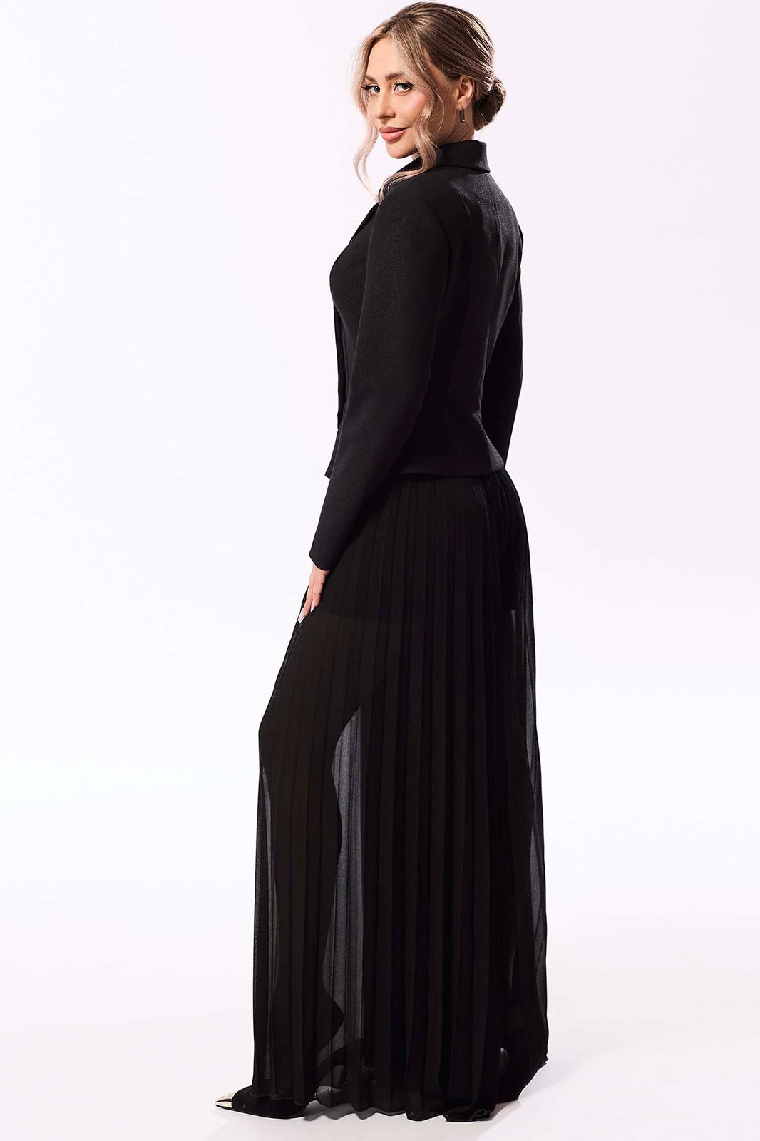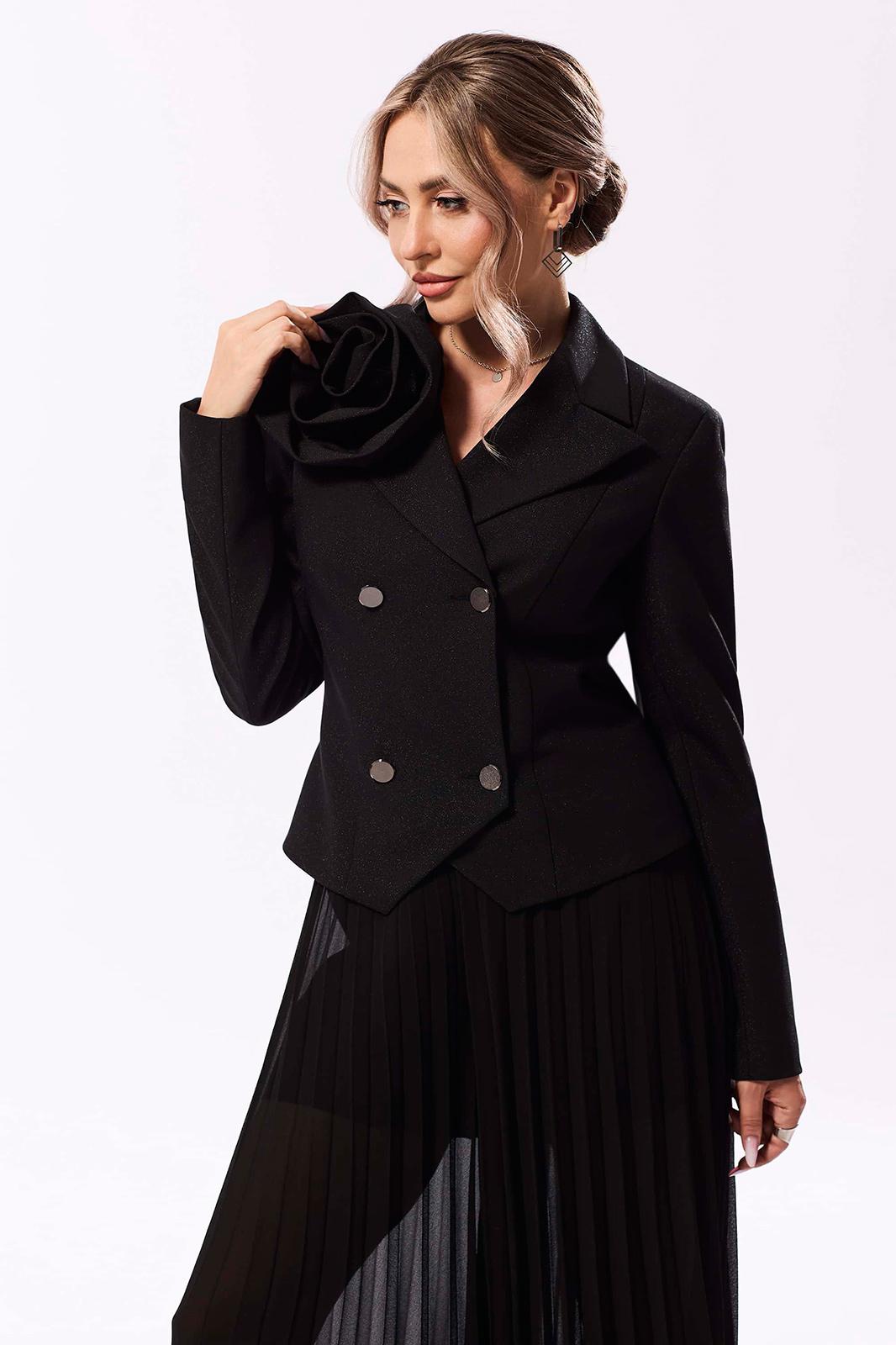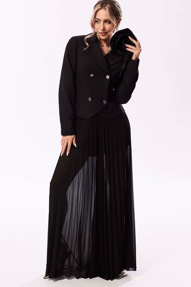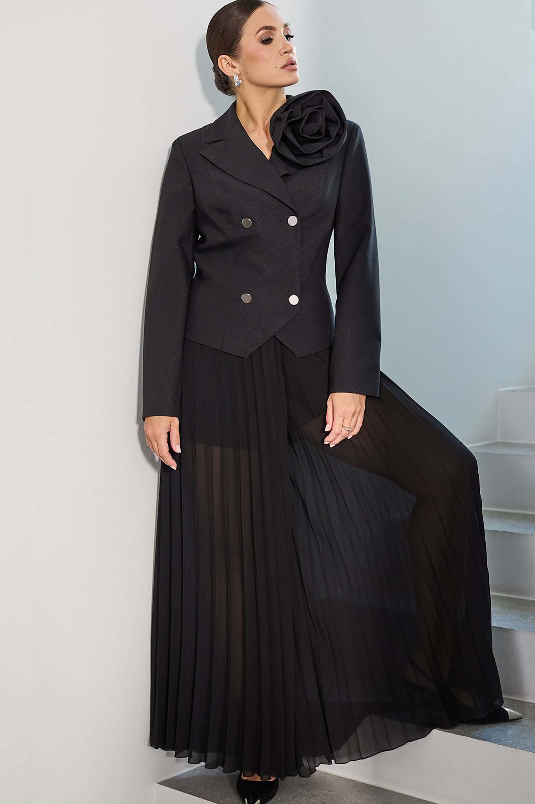 Жакет с центральной двубортной застежкой на петли и пуговицы, втачным воротником и лацканом пиджачного типа. По переду с рельефами, выходящими из плеча. По спинке со средним швом и рельефами, выходящими из плеча. Низ жакета фигурный. Рукав втачной, длинный. Жакет со съемной декором- брошью из основной ткани. Брюки- гофре расширенного силуэта, с отрезным поясом, без застежки, верх брюк присборен на резинку. Брюки без боковых швов.