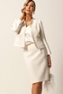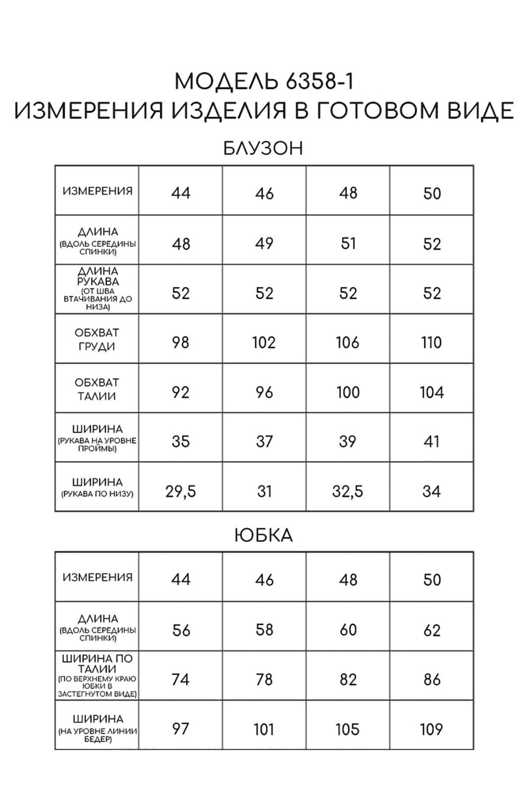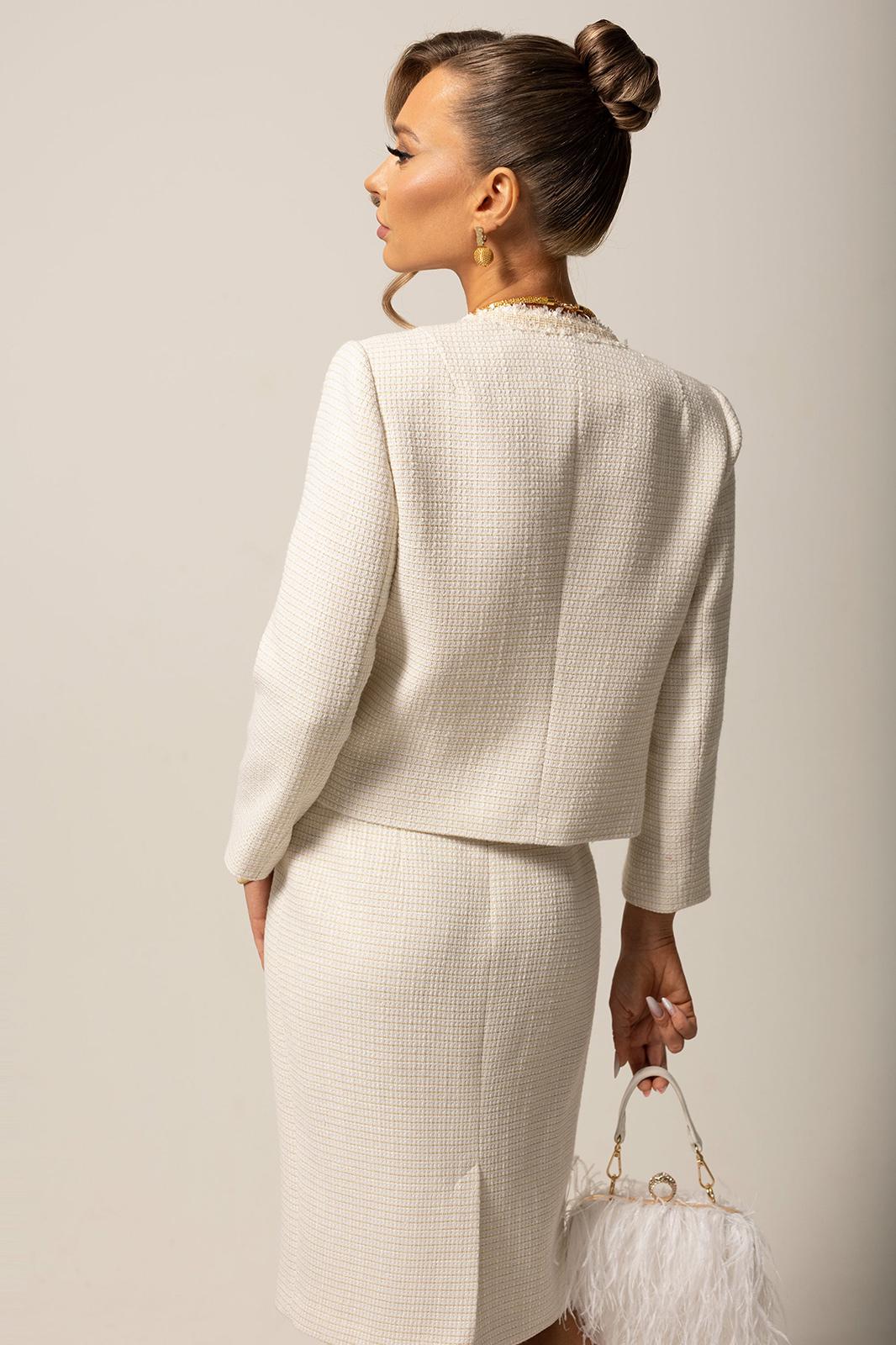Комплектация: жакет, юбка. Жакет с декоративной застежкой по переду, без воротника, с фигурным вырезом горловины. Перед с рельефами, выходящими из плеча, накладными карманами. Спинка со средним швом, вытачками, выходящими из плеча. Юбка без пояса, застежкой на потайную молнию в среднем шве задней половинки.. Заднее полотнище со средним швом, заканчивающимся шлицей, талиевыми вытачками. . Костюм на подкладке.