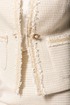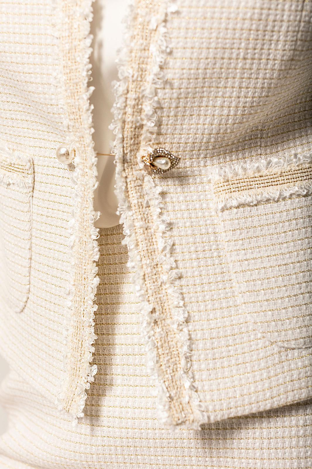 Цветовая гамма для верха, подкладки, фурнитуры, отделки: костюм выполнен из неэластичной ткани в одной цветовой гамме, жакет декорирован декоративной тесьмой с цепочкой.
