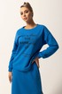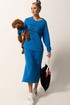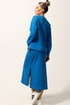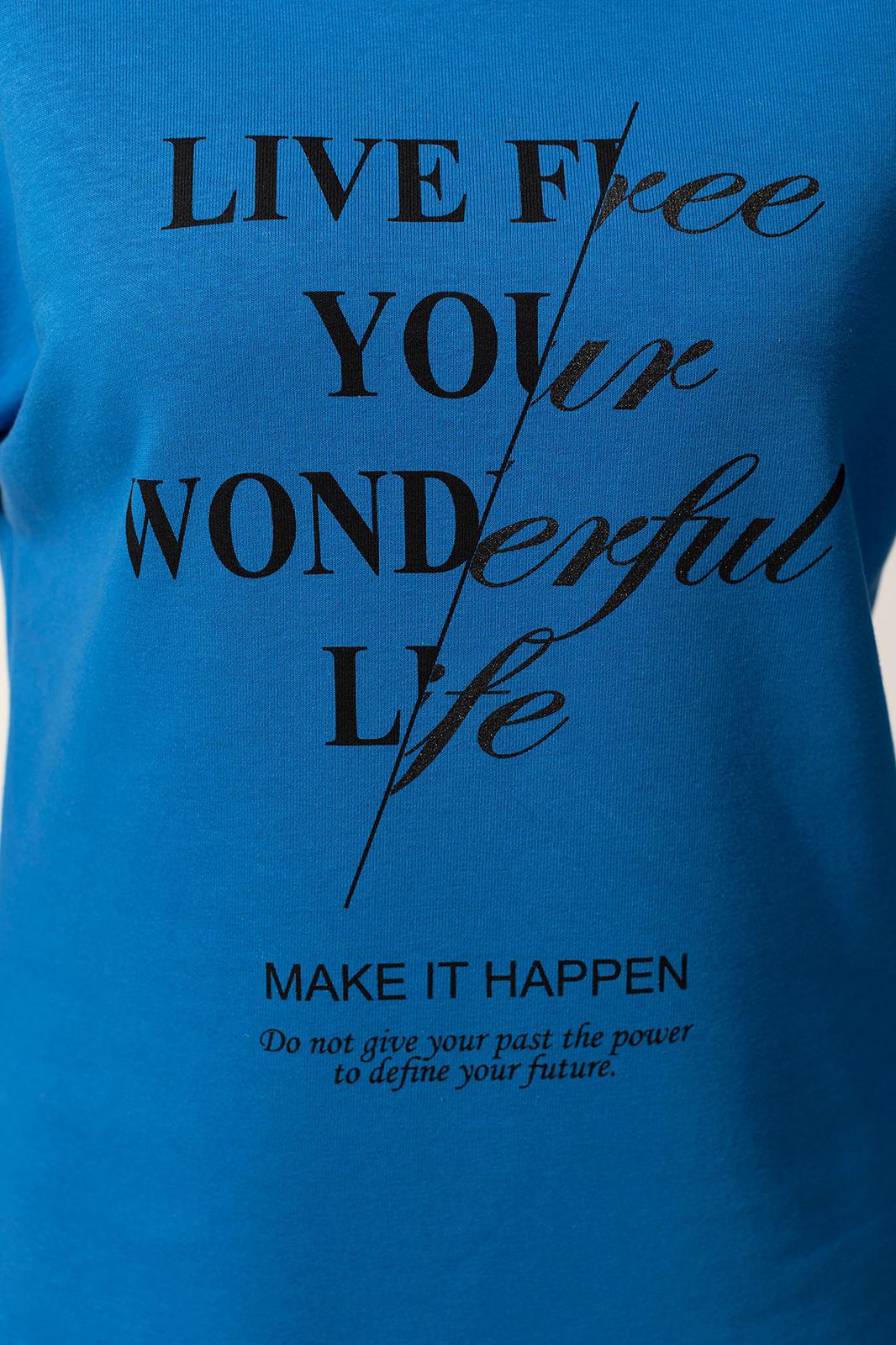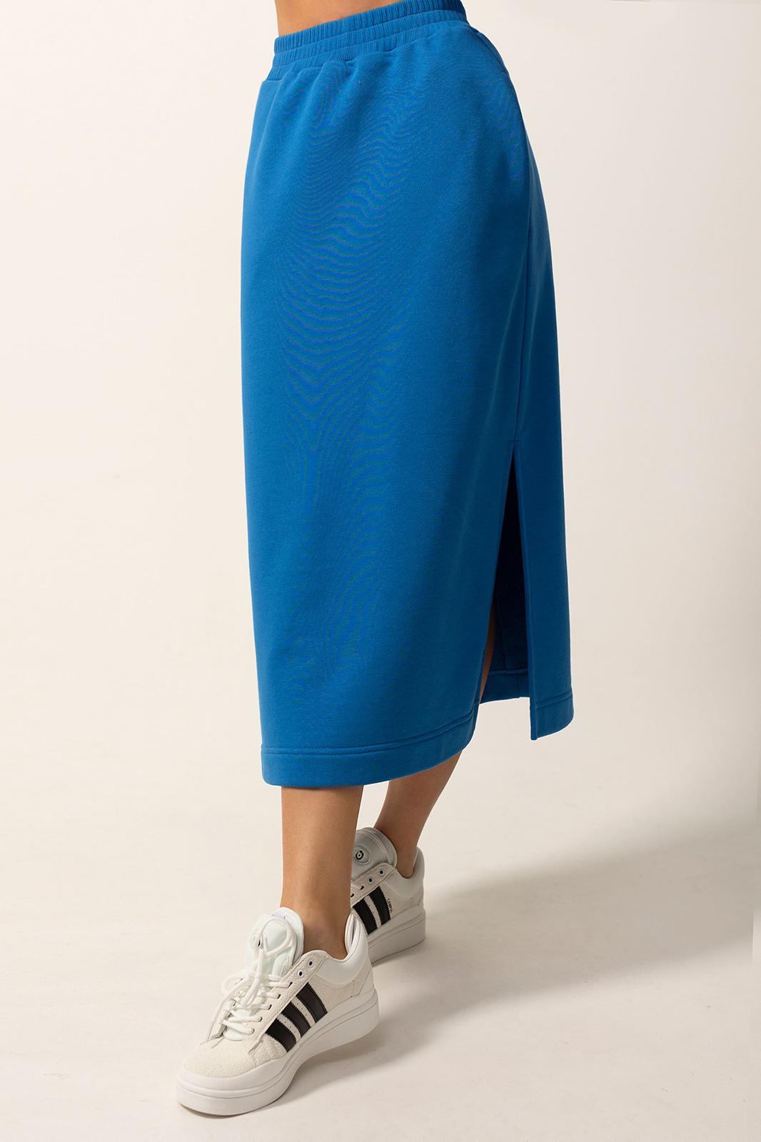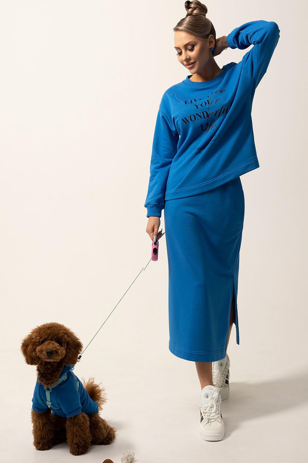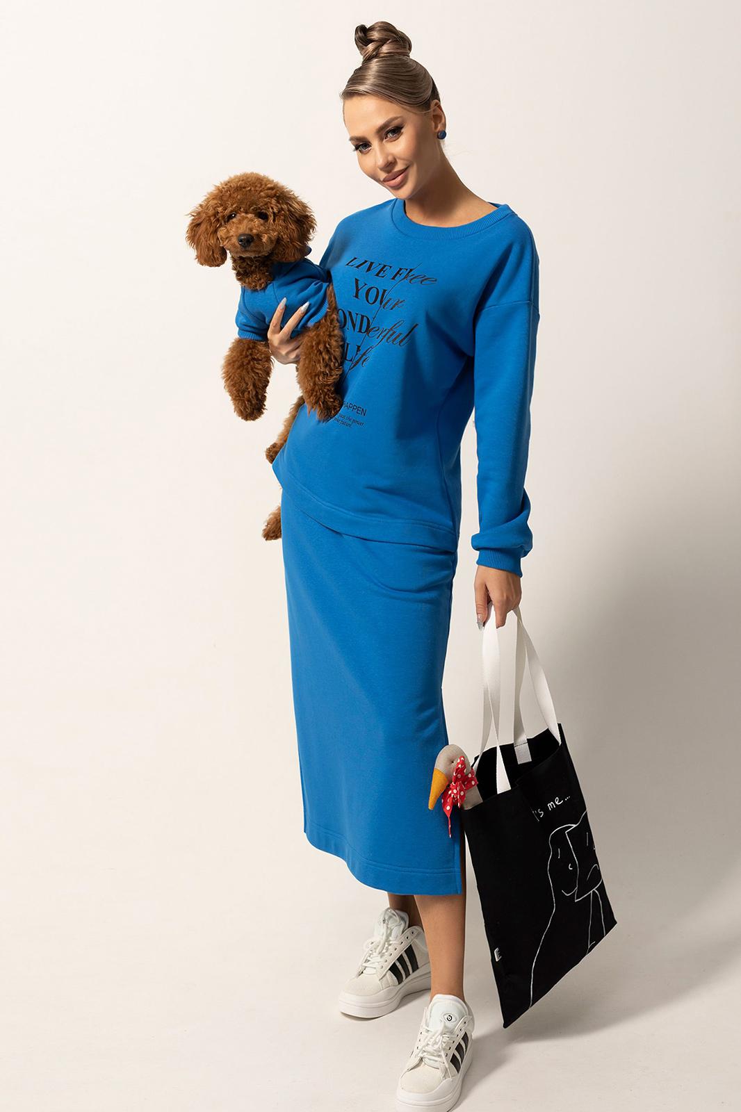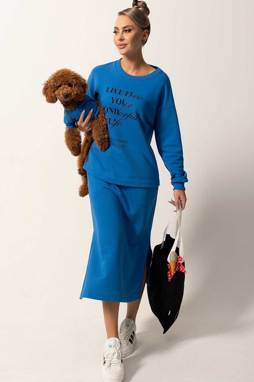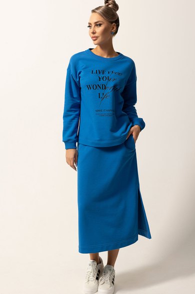 Блузон прямого силуэта с отрезной планкой по горловине. Перед и спинка цельные, рукав втачной, с отрезной манжетой. Плечо спущенное. Юбка прямого силуэта, с поясом, присборенным резинкой. Переднее полотнище цельное, заднее полотнище со средним. В боковых швах расположены карманы и разрезы.