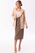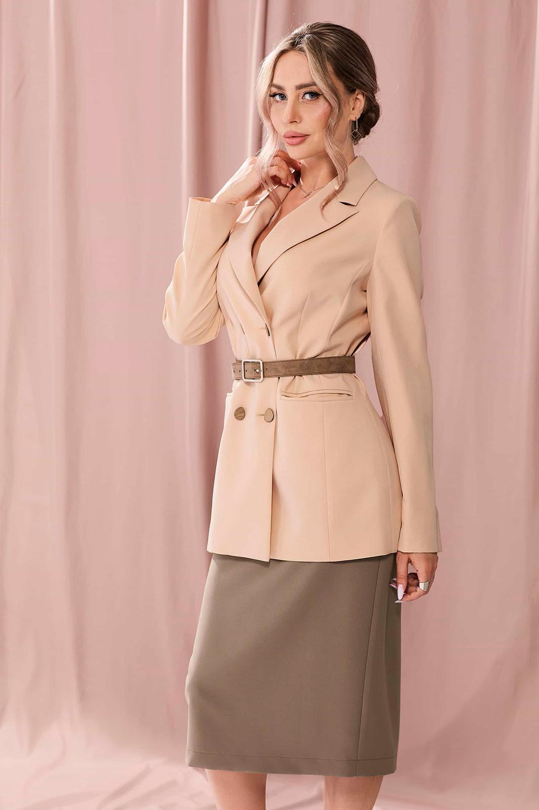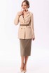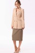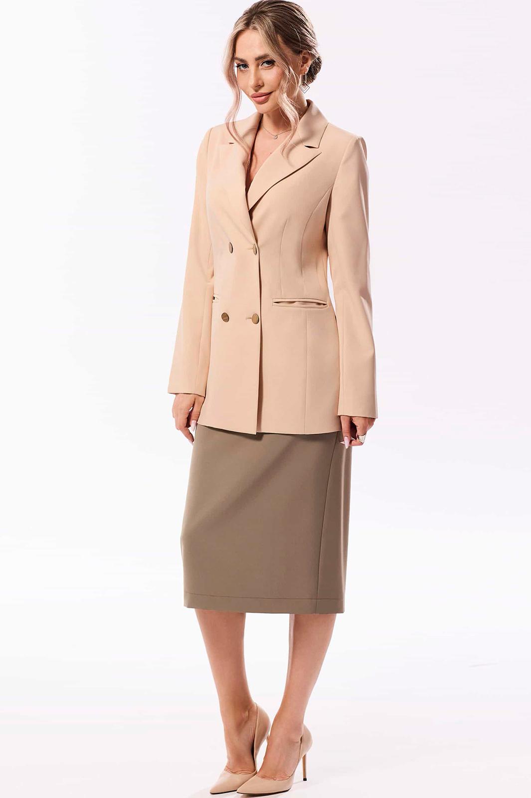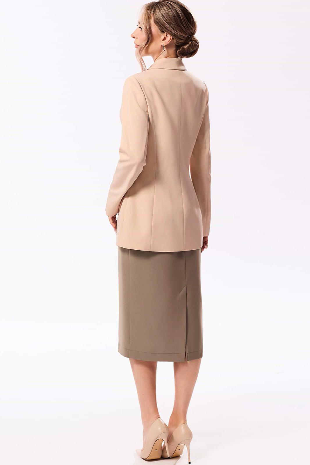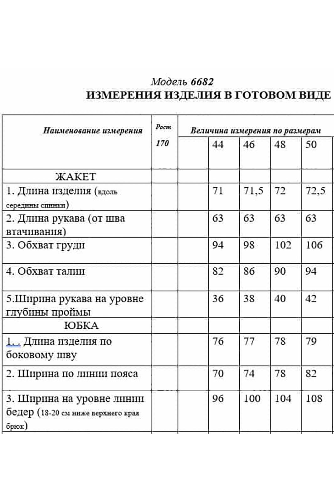 Комплектация: жакет, юбка. Жакет полуприлегающего силуэта с центральной двубортной застежкой на петли и пуговицы, с втачным воротником и отложными лацканами пиджачного типа. По переду с рельефами, выходящими из проймы, талиевыми вытачками. На уровне линии талии расположены прорезные карманы в рамку . Спинка со средним швом, рельефами, выходящими из проймы. Рукав втачной, длинный. Юбка прямая, с отрезным поясом. Пояс в области спинки присборен на резинку. Переднее полотнище цельное, заднее полотнище со средним швом, заканчивающимся щлицей. Застежка на потайную молнию.