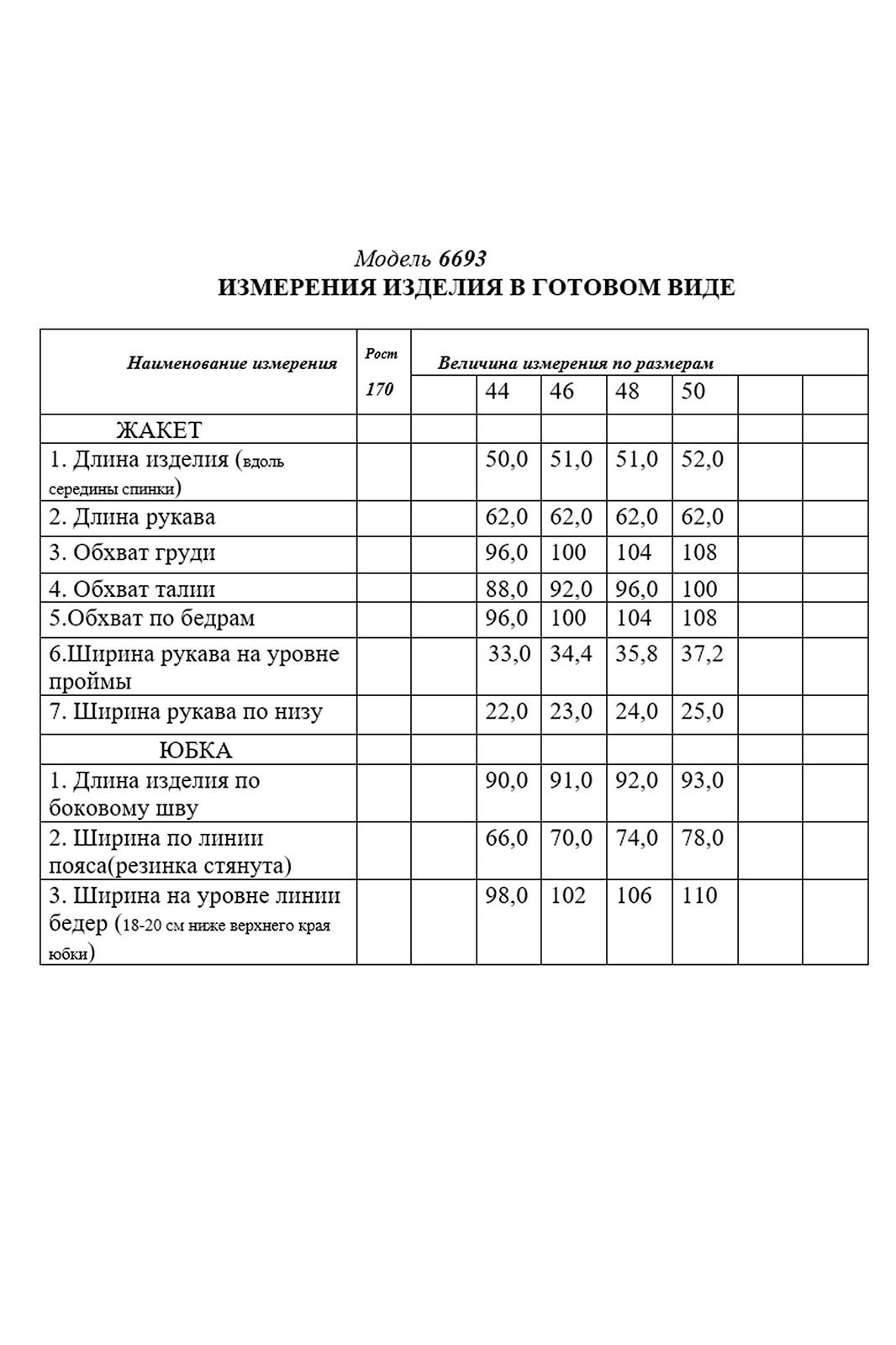 Костюм женский, состоит из жакета и юбки. Жакет, без воротника, с круглым вырезом горловины, центральной застежкой на петли и пуговицы. По переду с нагрудными вытачками и накладными карманами на уровне груди. По спинке с талиевыми вытачками. Рукав втачной, длинный. Юбка без пояса, по верхнему срезу юбки- резинка. На уровне линии бедер- накладные карманы. Заднее полотнище юбки со средним швом, заканчивающимся щлицей.