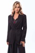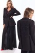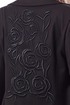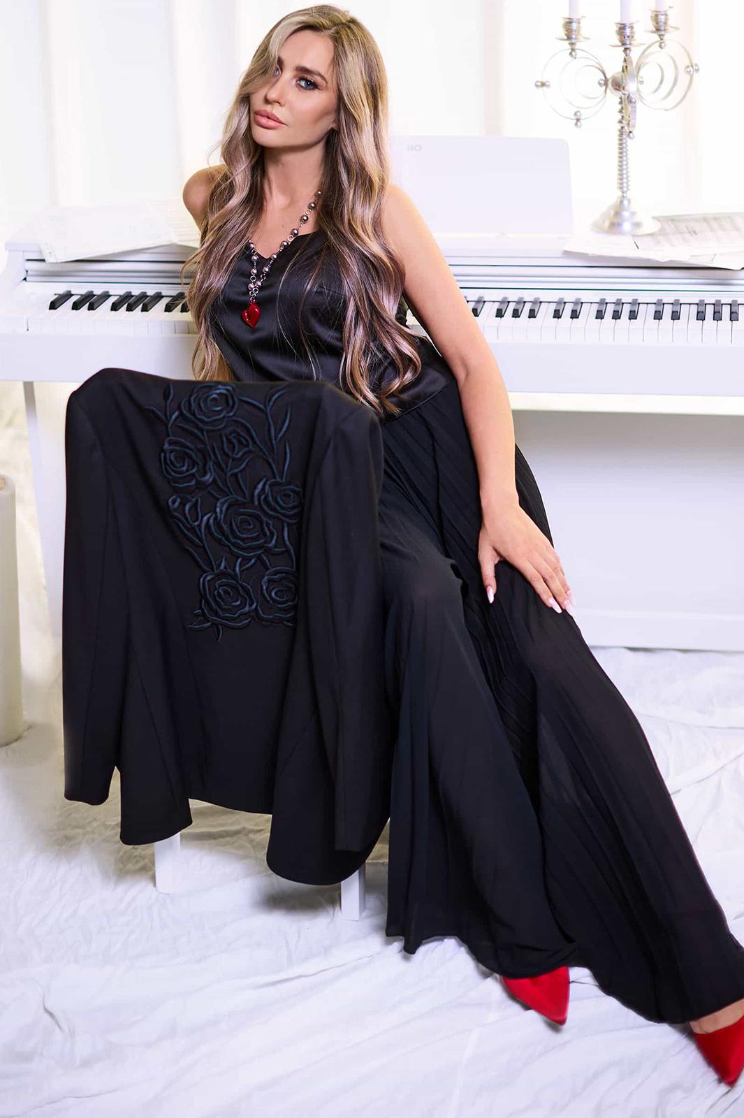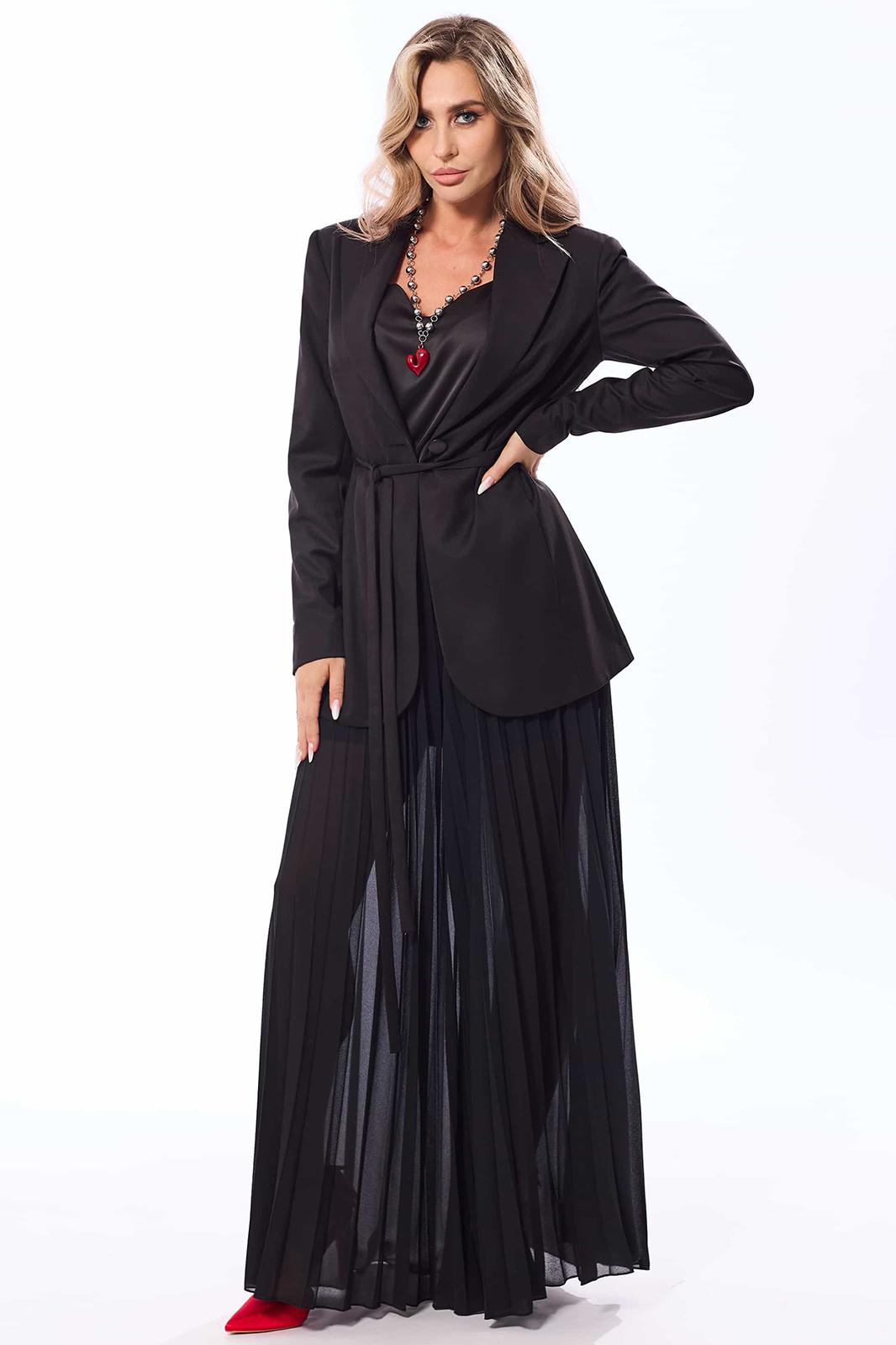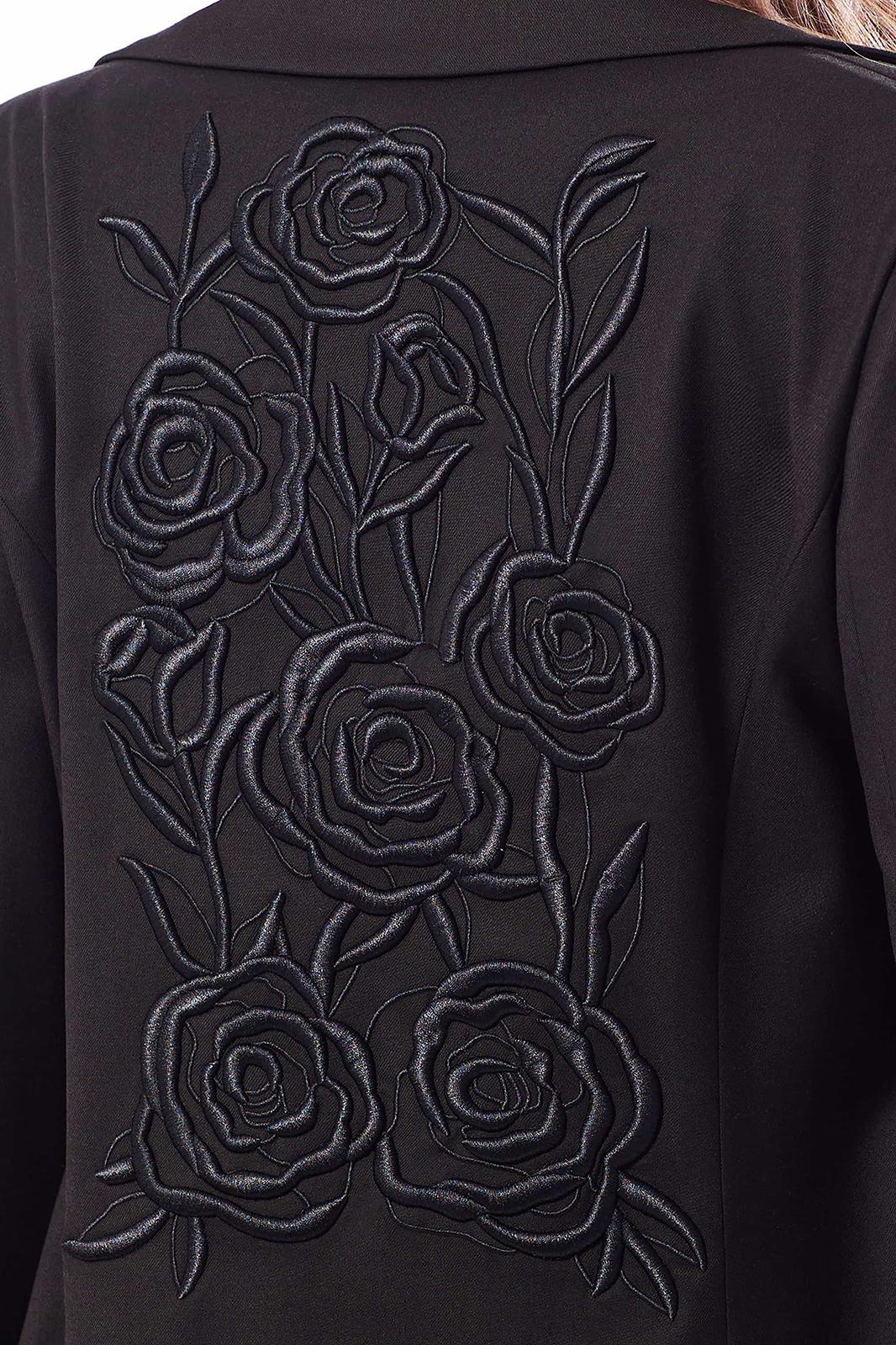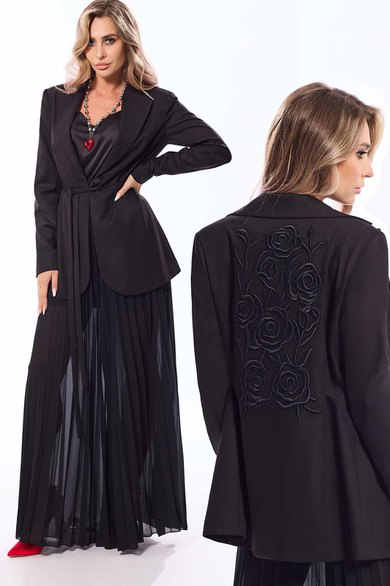 Жакет с центральной застежкой на петли и пуговицы, втачным воротником и лацканом пиджачного типа. По переду с рельефами, выходящими из проймы и нагрудными вытачками. В рельефных швах расположены карманы. По спинке с рельефами, выходящими из проймы. Центральная часть спинки с вышивкой в тон основной ткани. Рукав втачной, длинный.