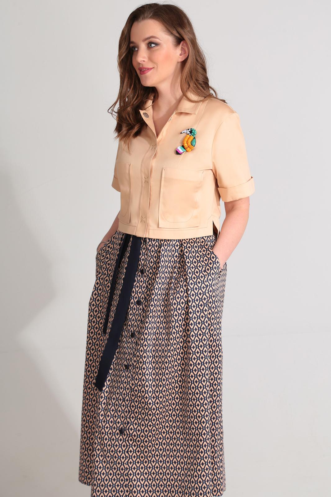 Цветовая гамма для верха, подкладки, фурнитуры, отделки: жакет из эластичной ткани в одной цветовой гамме. Фурнитура- пришивные кнопки никель. Жакет декорирован съемной брошью.