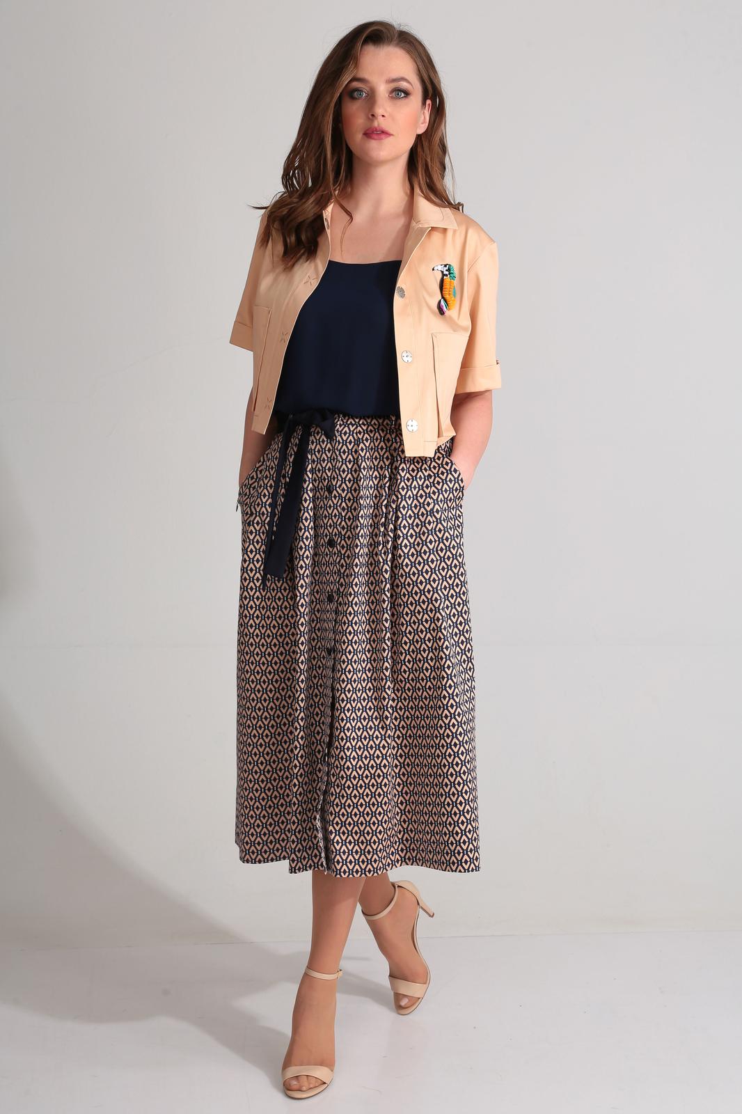 Жакет с центральной застежкой на пришивные кнопки, отложным воротником. По переду с нагрудными вытачками, выходящими из плеча, накладными карманами. Спинка с отрезной кокеткой.