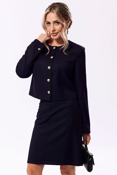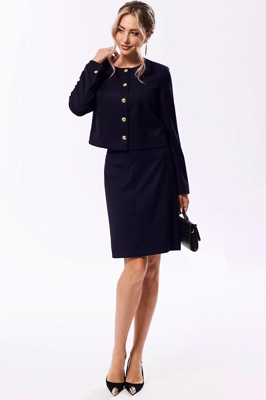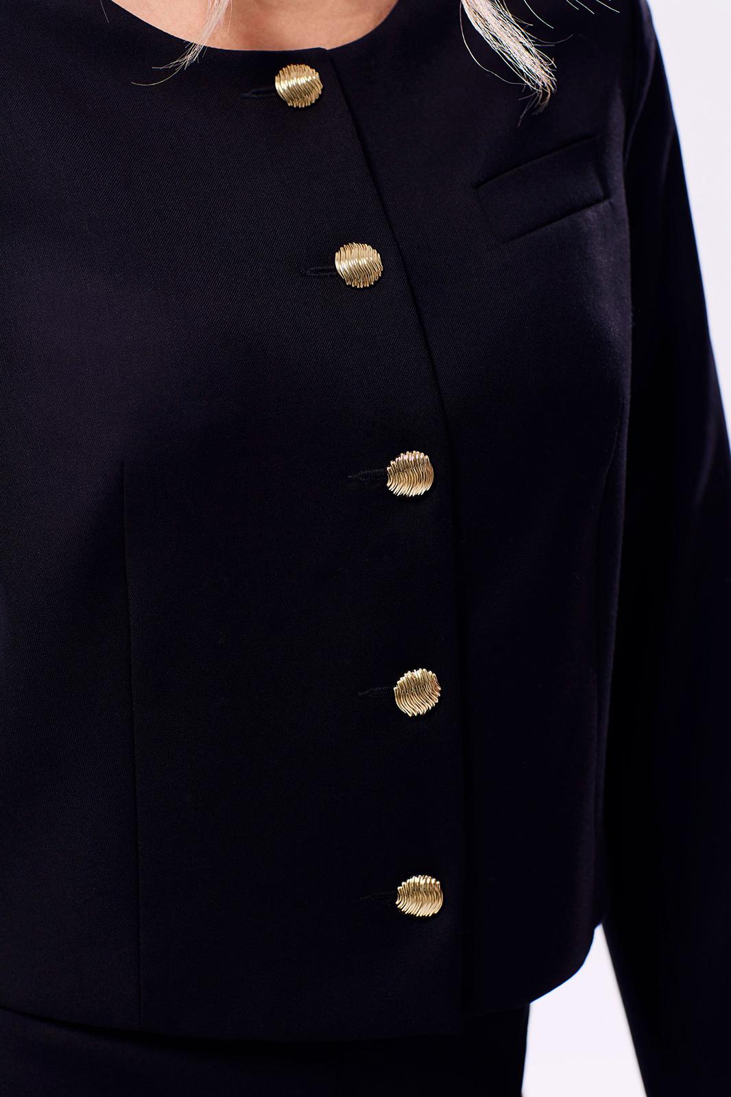 Жакет с центральной застежкой на петли и пуговицы, без воротника. По переду с талиевыми вытачками. Спинка со средним швом,талиевыми вытачками. Рукав втачной, длинный со шлицей и застежкой на петлю и пуговицу.