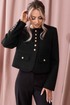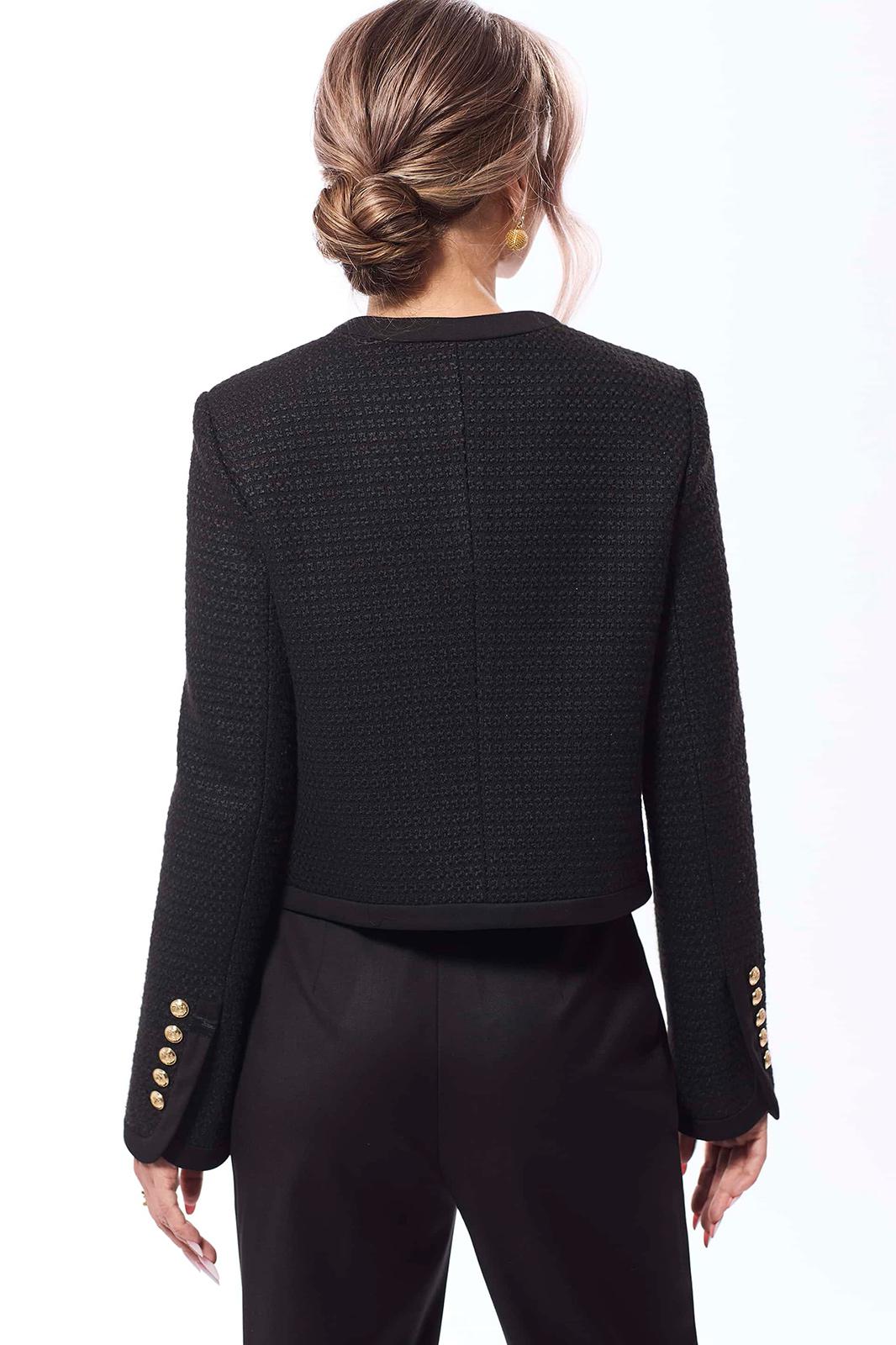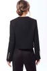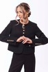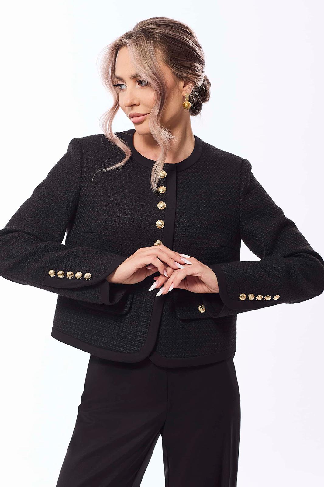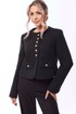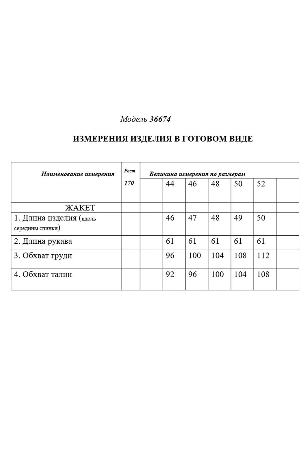 Жакет с центральной застежкой на петли и пуговицы, без воротника, с круглым вырезом горловины. По переду с нагрудными вытачками. На уровне линии талии- настрочные клапаны, зафиксированные к жакету петлей и пуговицей. Низ жакета фигурный. По горловине, краю борта и низу- настрочная планка. Спинка со средним швом. Рукав втачной, длинный со шлицей по локтевому шву и застежкой на петли и пуговицы. По низу рукава и шлице- отрезная планка.