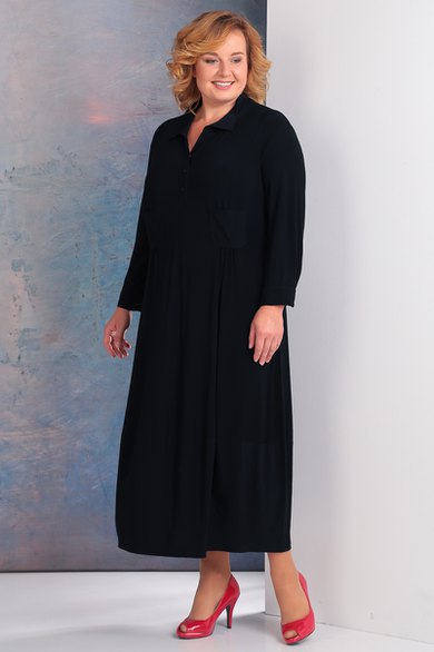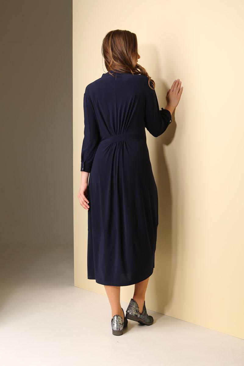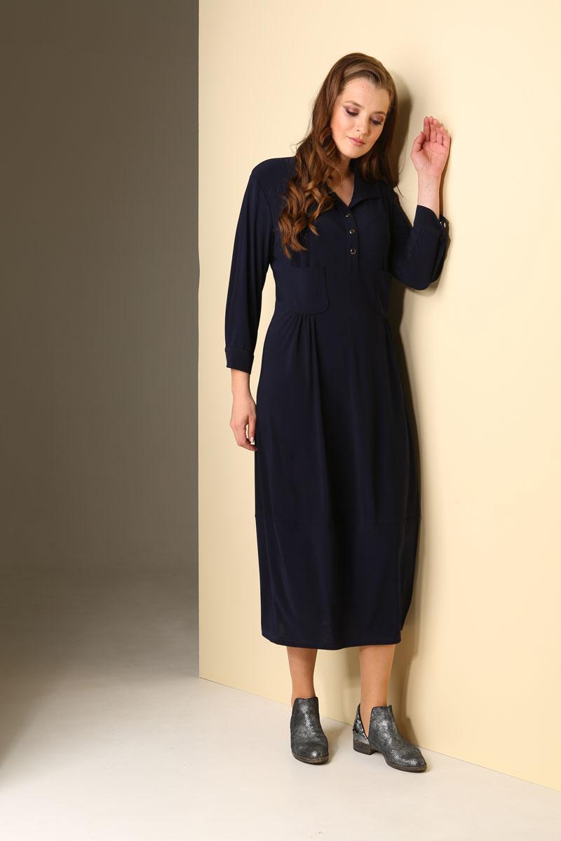 Платье с центральной застежкой на петли и пуговицы на планке переда, воротником-стойкой. Перед с двумя накладными карманами, расположенными ниже линии груди, сборкой под карманами. Спинка со средним швом, сборкой и патой на уровне линии талии.