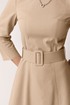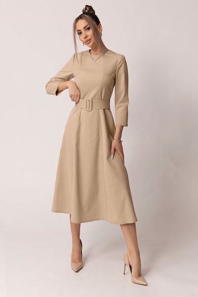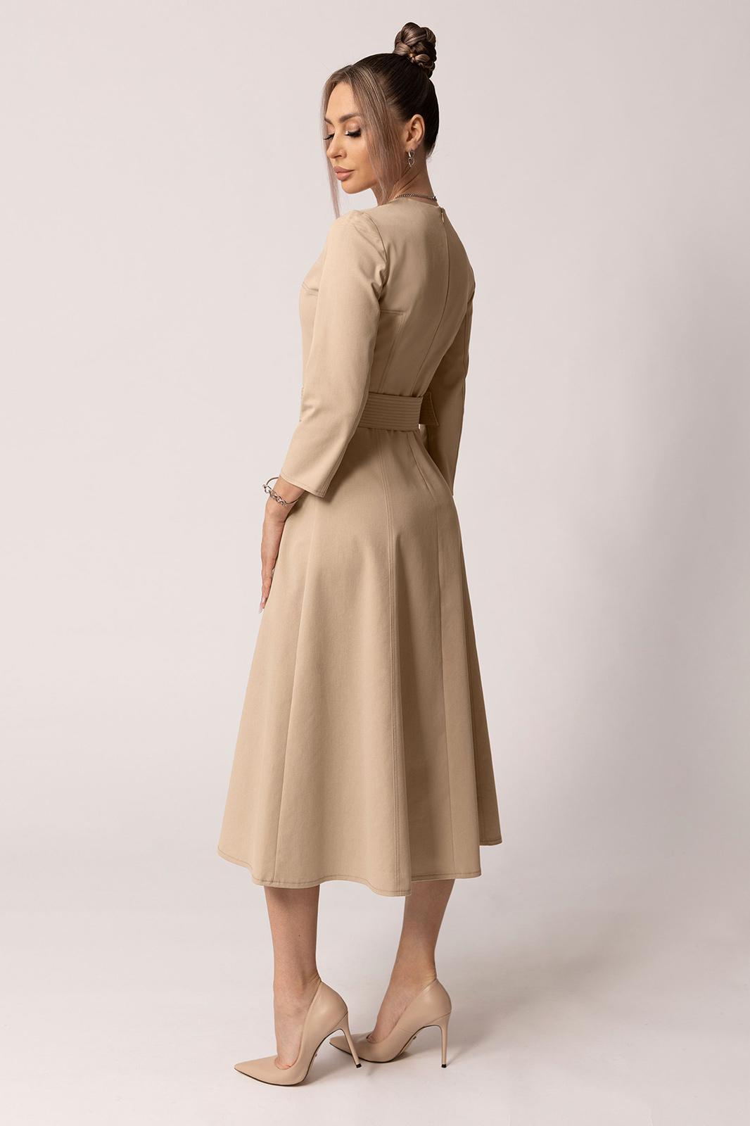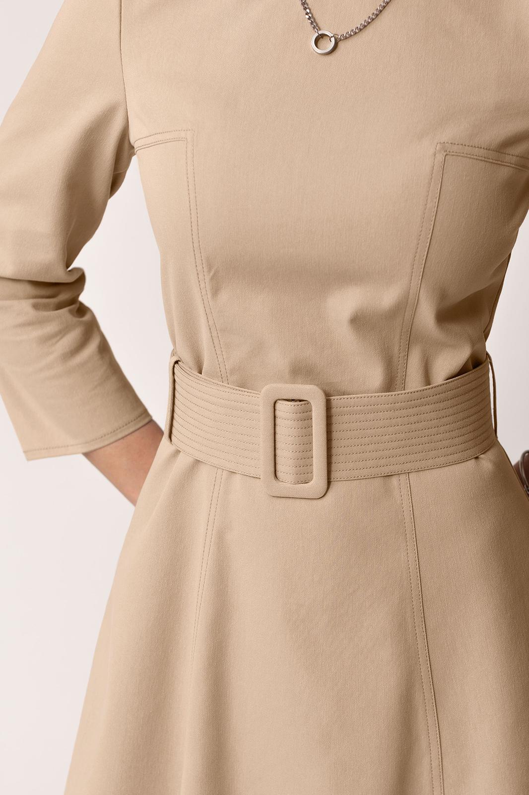 Платье полуприлегающего силуэта без воротника, с круглым вырезом горловины, застежкой на потайную молнию в среднем шве спинки. По переду с фигурными рельефами, выходящими из проймы. Спинка со средним швом, фигурными рельефами, выходящими из проймы. Рукав втачной, 3/4. Платье со съемным поясом. платье из ткани в одной цветовой гамме. Отделочные строчки контрастны основной ткани. Платье без подкладки.