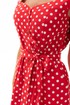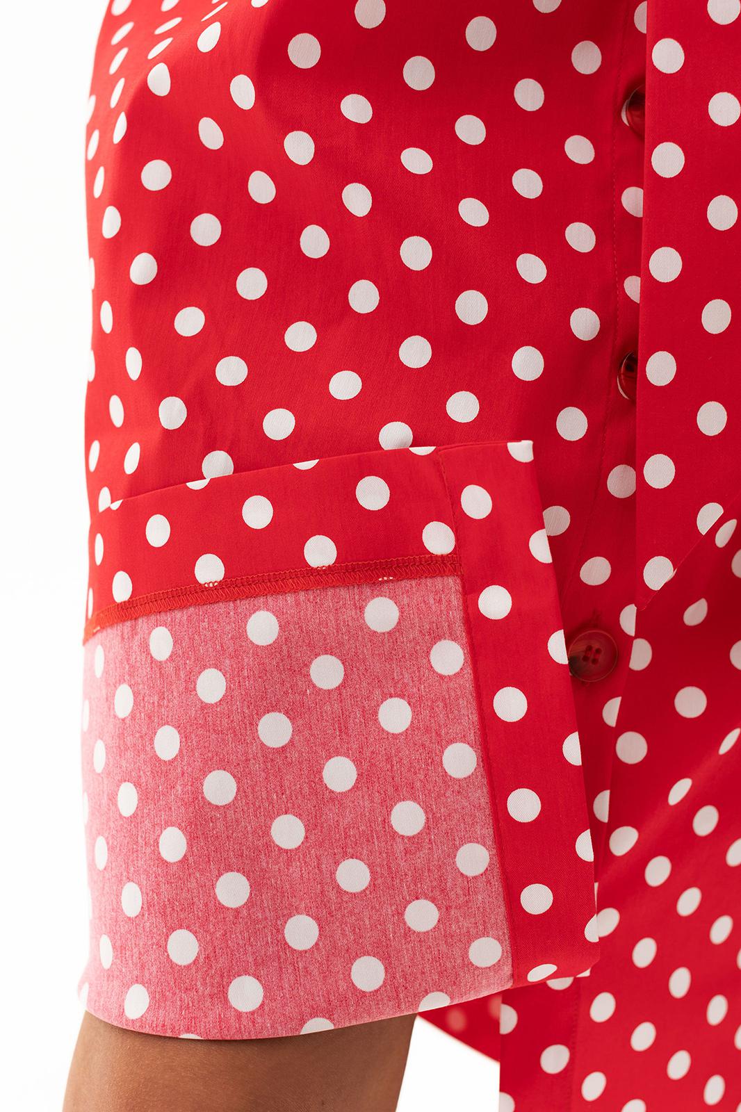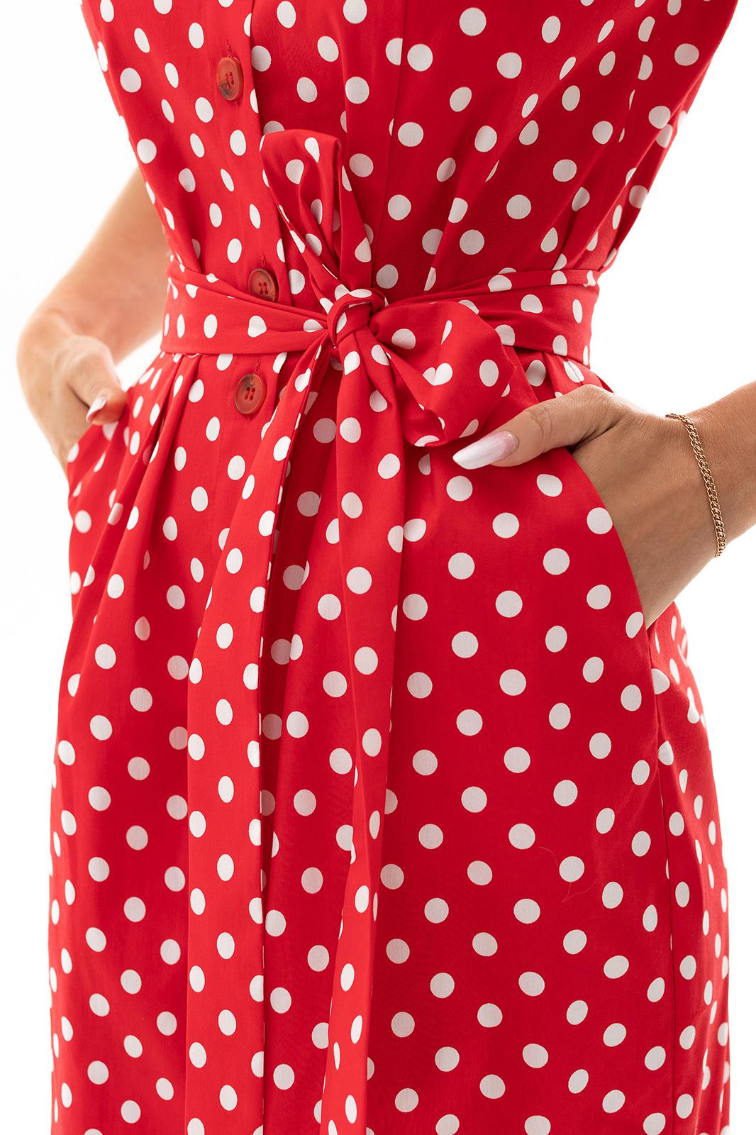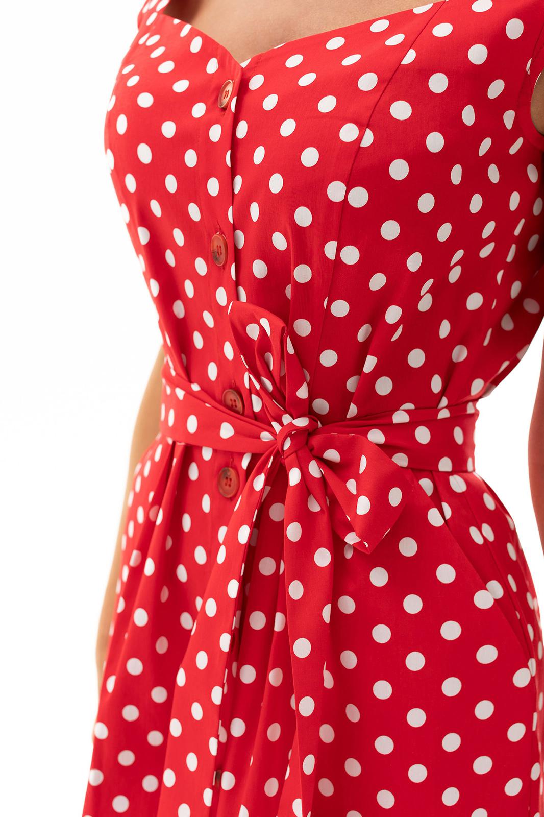 Платье с центральной застежкой на петли и пуговицы, с фигурным вырезом горловины. Платье отрезное по линии талии. Верхняя часть переда с рельефами, выходящими из горловины, нижняя часть переда с карманами и односторонними складками по талии. Верхняя часть спинки с рельефами, выходящими из горловины. Нижняя деталь спинки с талиевыми вытачками. Платье со съемным поясом. Рукав- крылышко.