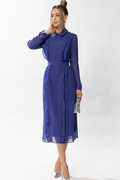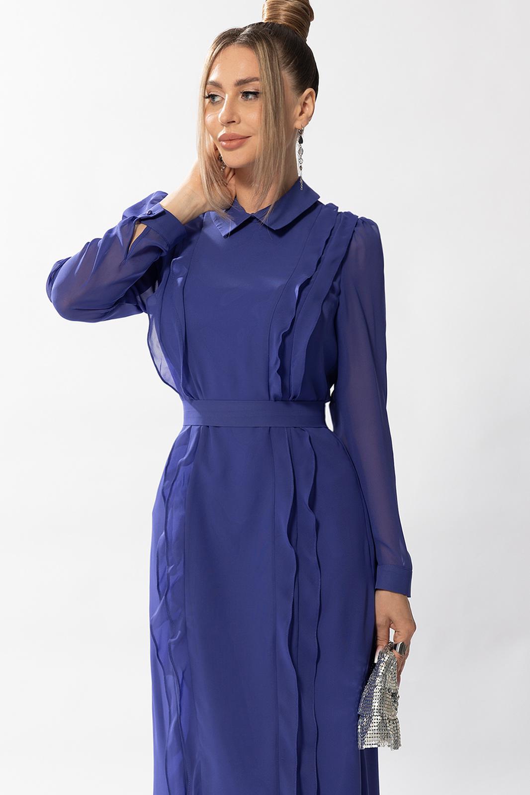 Платье полуприлегающего силуэта, с застежкой на потайную молнию в среднем шве спинки, с втачным воротником с отрезной стойкой. По переду с двумя рельефными швами, выходящими из плеча до низа. Из рельефных швов выходят рюши. Спинка со средним швом, заканчивающимся разрезом, талиевыми вытачками. Рукав втачной, длинный, с отрезной манжетой. Платье со съемным поясом. Платье на подкладке.