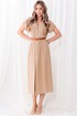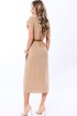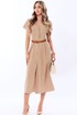Платье, с отложным воротником и лацканами, центральной застежкой на петли и пуговицы. По переду с накладными карманами, расположенными на уровне груди. Спинка с отрезной кокеткой, плечевой шов переходит на перед. Рукав короткий, цельнокроенный. Платье со съемным поясом. Платье без подкладки.