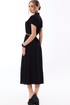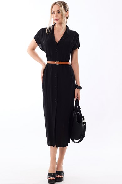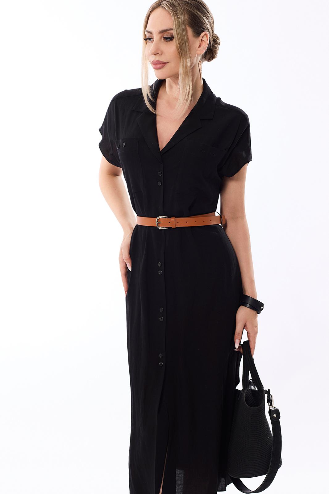 Платье, с отложным воротником и лацканами, центральной застежкой на петли и пуговицы. По переду с накладными карманами, расположенными на уровне груди. Спинка с отрезной кокеткой, плечевой шов переходит на перед. Рукав короткий, цельнокроенный. Платье со съемным поясом. Платье без подкладки.