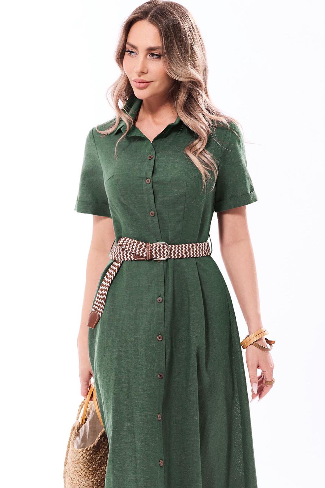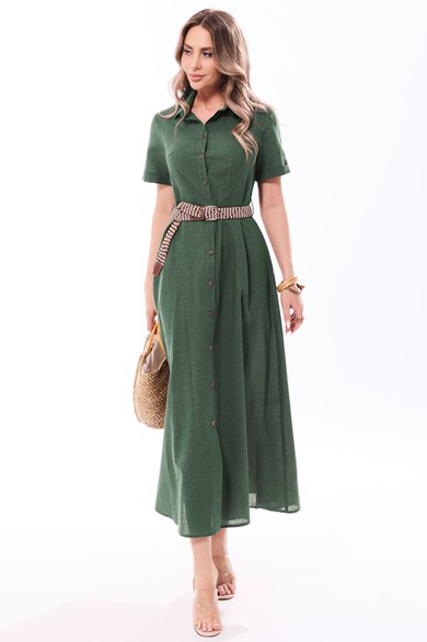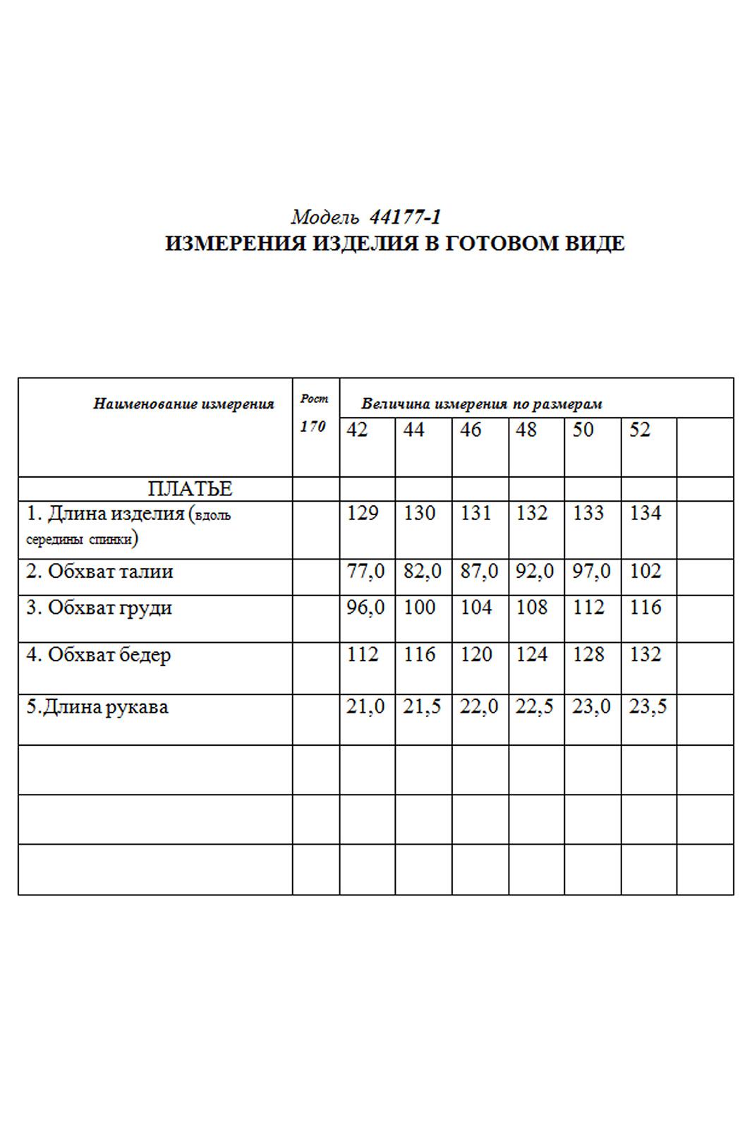 Платье с центральной застежкой на петли и пуговицы, с втачным воротником с отрезной стойкой. Платье отрезное по линии талии. По лифу переда, нагрудные и талиевые вытачки. Лиф спинки с талиевыми вытачками. Рукав втачной, короткий. В боковых швах расположены карманы. Платье со съемным поясом.