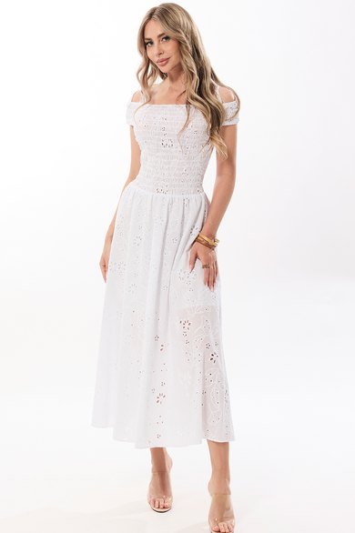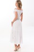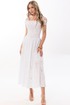 Платье без застежки, на тонких бретелях, с коротким рукавом-реглан, отрезное по линии талии. Лиф переда, спинки и рукава присборены рядами резинки. Верхний край горловины переда и спинки, проймы присборены на резинку. Низ платья на подкладке.