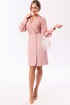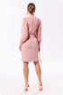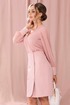Платье без воротника, с V-образным вырезом горловины, центральной двубортной застежкой на петли и пуговицы по нижней части переда. Платье отрезное по линии талии. По лифу переда полочки с запахом, на уровне груди фиксируются пришивной кнопкой По шву притачивания к нижней части переда лиф переда и спинки присборен. Нижняя часть спинки с талиевыми вытачками. Рукав втачной, длинный, с отрезной манжетой, по шву притачивания манжеты присборен на резинку. Окат рукава присборен. Лиф переда и спинки и рукав- из шифона в тон основной ткани.