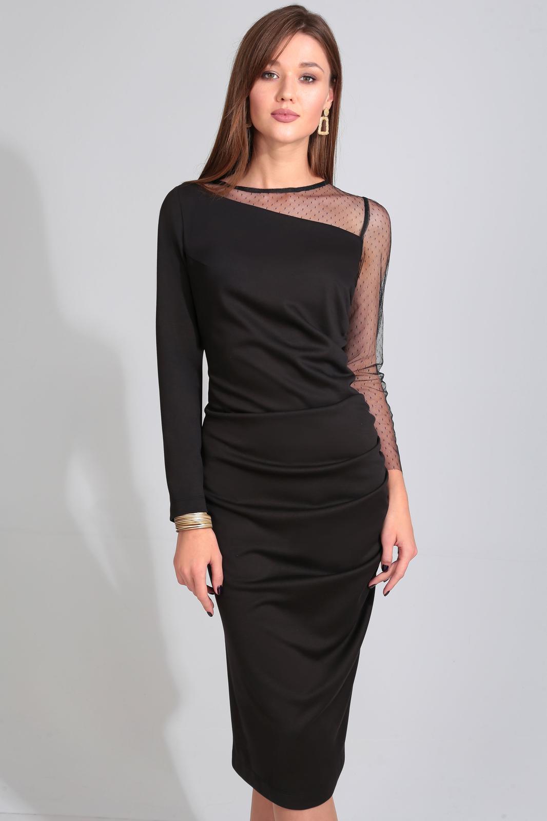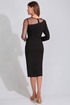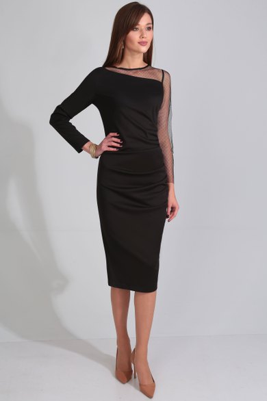 Нарядное платье без воротника, с круглым вырезом горловины, застежкой на потайную молнию в среднем шве спинки. Перед с асимметричной кокеткой, нагрудной вытачкой выходящей из правого бокового шва, сборкой по левому боковому шву. Спинка со средним швом, заканчивающимся шлицей, талиевыми вытачками, асимметричной кокеткой.