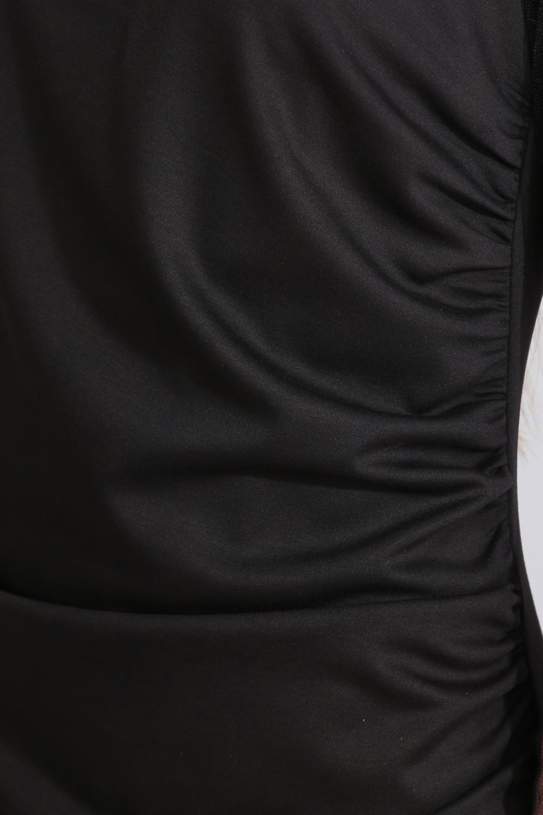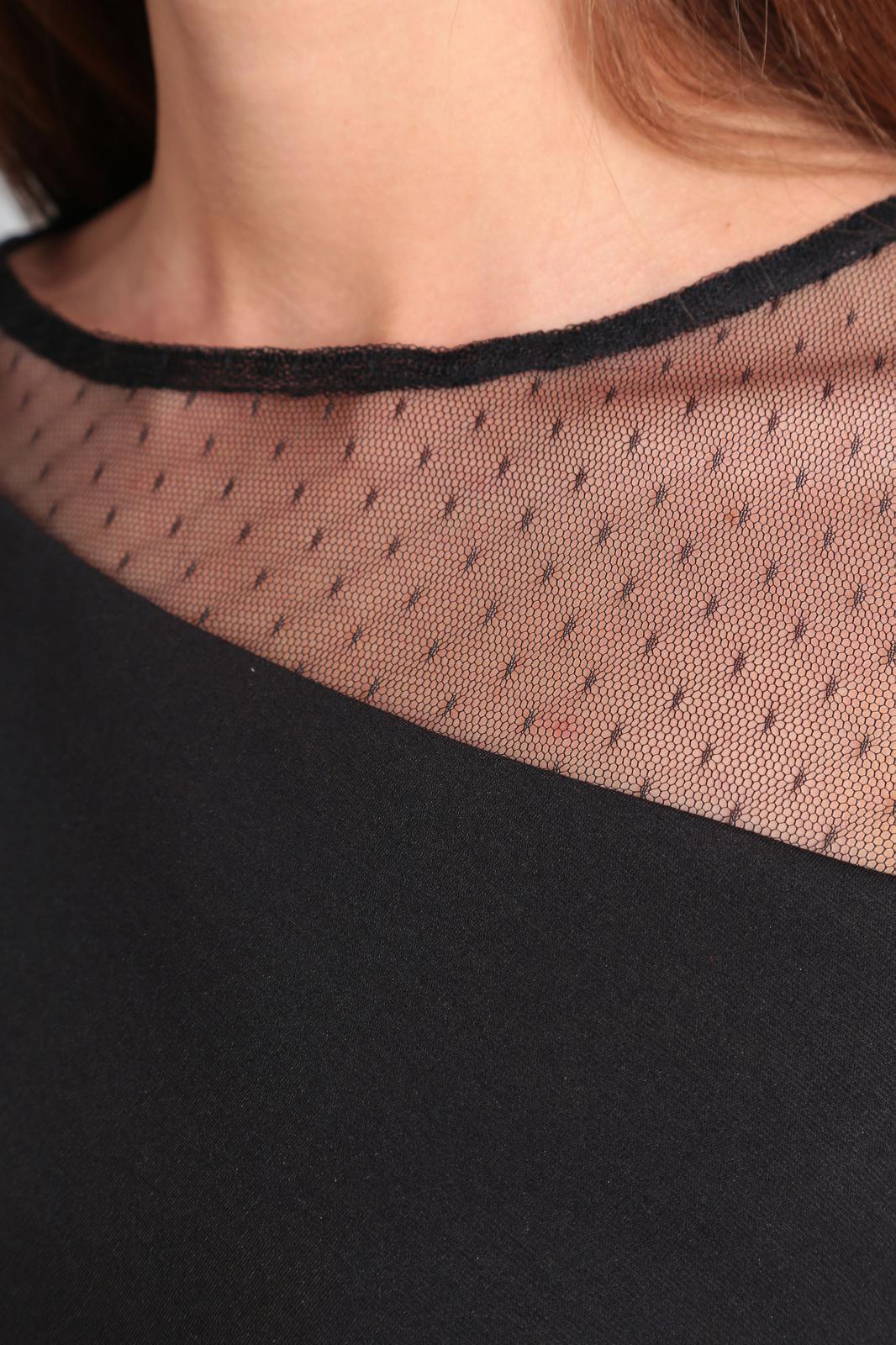 Цветовая гамма для верха, подкладки, фурнитуры, отделки: платье из эластичной ткани с люрексом в одной цветовой гамме. Кокетки переда и спинки и левый рукав из сетки в тон основной ткани. Левый рукав декорирован вышивкой.