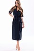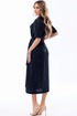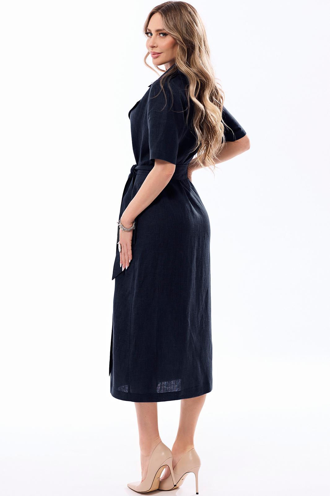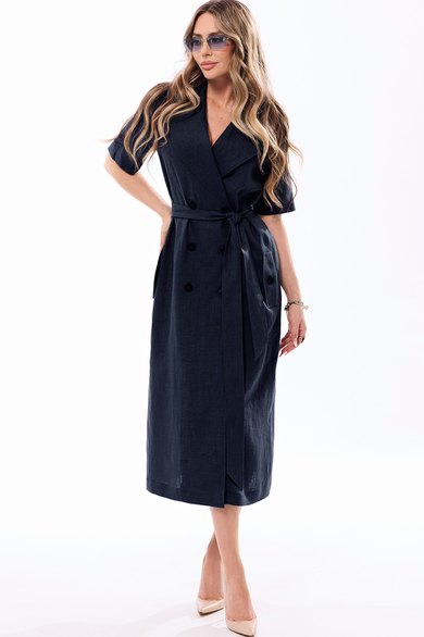 Платье с центральной двубортной застежкой на петли и пуговицы, втачным воротником и отложными лацканами. В боковых швах расположены карманы с настрочными клапанами. Спинка с отрезной кокеткой. По плечевым швам декоративные погоны, зафиксированные петлей и пуговицей. Платье со съемным поясом.