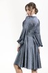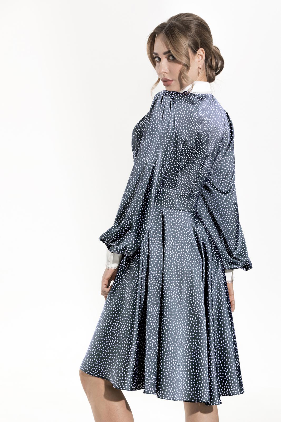 Платье, с центральной застежкой на петли и пуговицы, втачным воротником с отрезной стойкой. В левом боковом шве дополнительная застежка на потайную молнию. Перед и спинка с втачным поясом. Нижняя часть платья расклешенная. Верхняя часть переда с вытачками, верхняя часть спинки платья с талиевыми вытачками и средним швом. Рукав втачной, длинный, с отрезной манжетой. Окат и шов притачивания рукава к манжете - со сборкой.