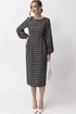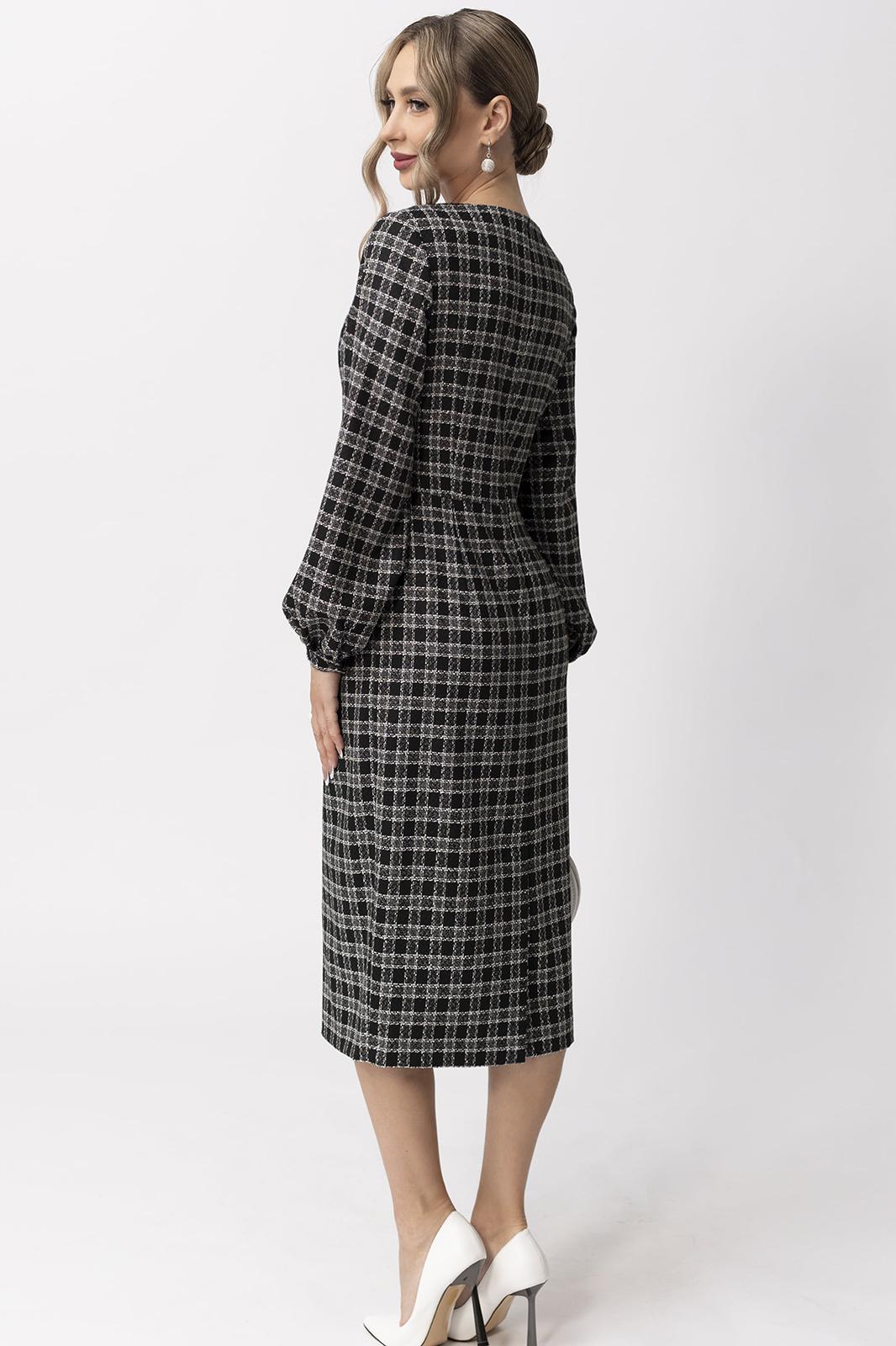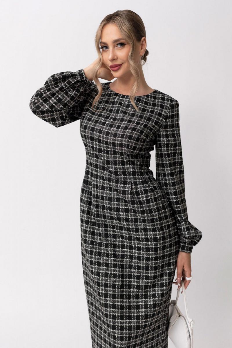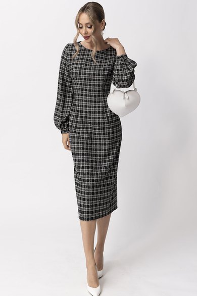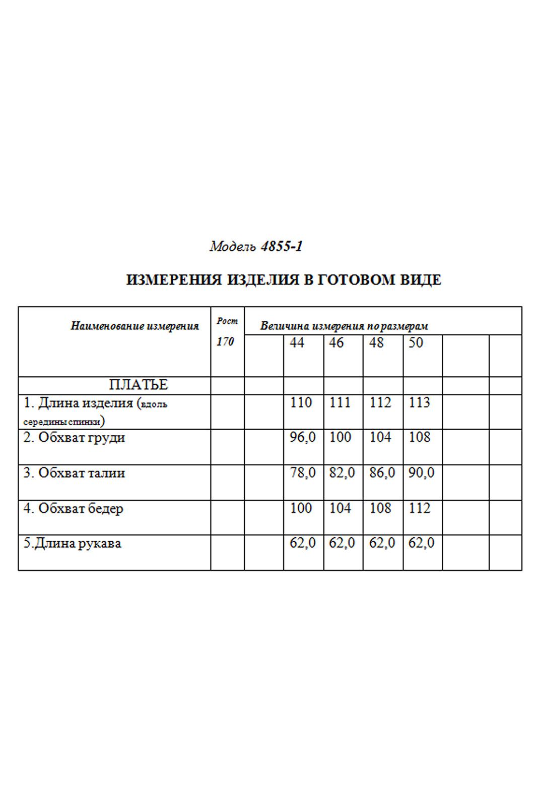 Платье, с застежкой на потайную молнию в среднем шве спинки, без воротника, с круглым вырезом горловины. Платье отрезное по линии талии. Лиф переда с талиевыми и нагрудными вытачками. Нижняя часть переда с двумя встречными складками, выходящими из талиевого шва, карманами от талиевого шва до бокового. Спинка со средним швом, заканчивающимся шлицей, талиевыми и нагрудными вытачками. Рукав втачной, длинный, с отрезной манжетой, застегивающейся на одну петлю и пуговицу. Низ рукава присборен. Платье без подкладки.