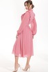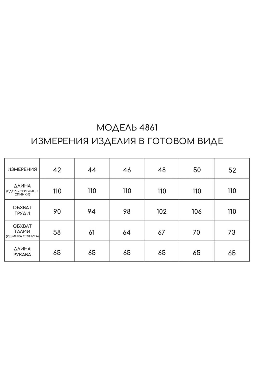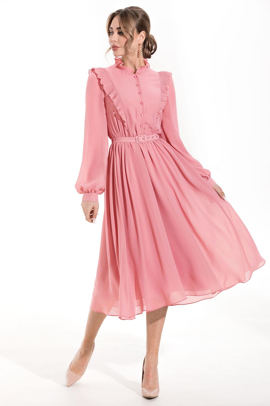 Платье, с воротником- стойкой, центральной застежкой на петли и пуговицы. Платье отрезное по линии талии. Шов по талии присборен на резинку. Верхняя часть переда с рельефами, выходящими из плеча, рюшей, выходящей из рельефов. Верхняя часть спинки с рельефами, выходящими из плеча и рюшей, выходящей из рельефов. Рукав втачной, длинный, с отрезной манжетой. По окату и шву притачивания манжеты рукав присборен. Платье со съемным поясом. Платье на подкладке.