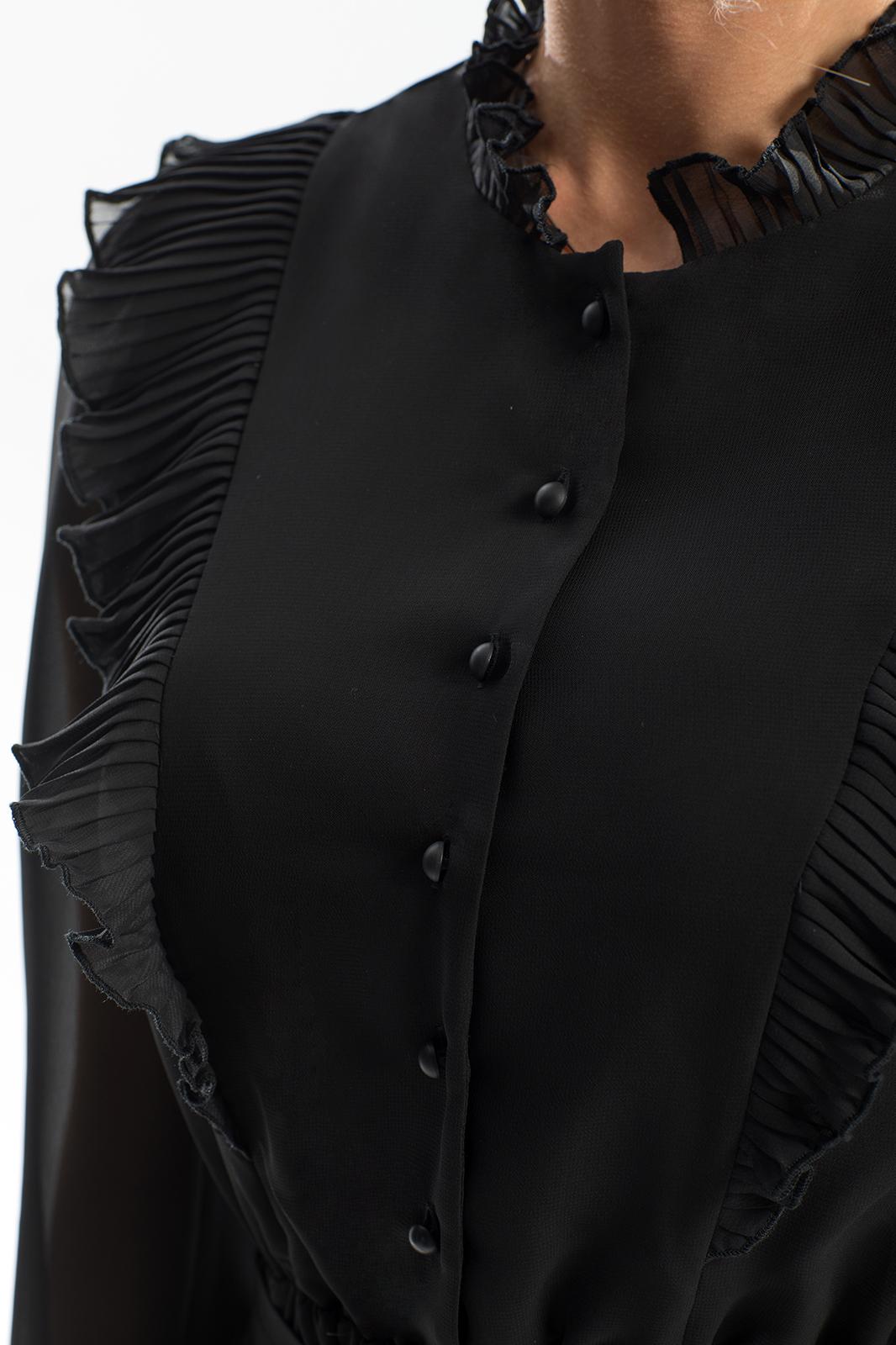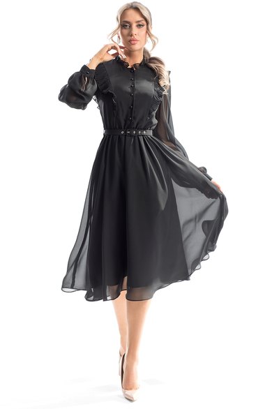 Платье, с воротником- стойкой, центральной застежкой на петли и пуговицы. Платье отрезное по линии талии. Шов по талии присборен на резинку. Верхняя часть переда с рельефами, выходящими из плеча, рюшей, выходящей из рельефов. Верхняя часть спинки с рельефами, выходящими из плеча и рюшей, выходящей из рельефов. Рукав втачной, длинный, с отрезной манжетой. По окату и шву притачивания манжеты рукав присборен. Платье со съемным поясом.