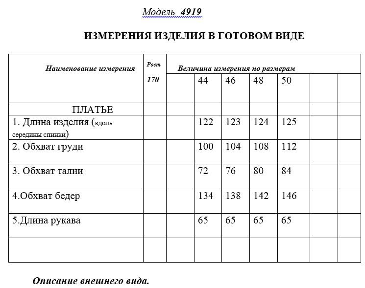 Описание внешнего вида: Платье без застёжки. Платье отрезное по линии талии. Верхняя часть переда с нагрудными вытачками. По горловине стойка- рюша с завязкой. Верхняя часть спинки со сборкой по шву притачивания стойки. Шов по талии присборен резинкой. Юбка с двумя сечениями, в которые вставлены присборенные рюши. Рукав втачной, присборенный на резинку. По окату рукава сборка. Цветовая гамма для верха, подкладки, фурнитуры, отделки: платье из ткани в одной цветовой гамме. Комплектация: платье на подкладке
