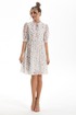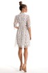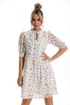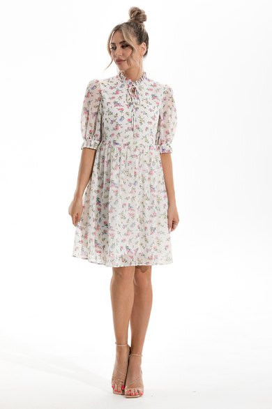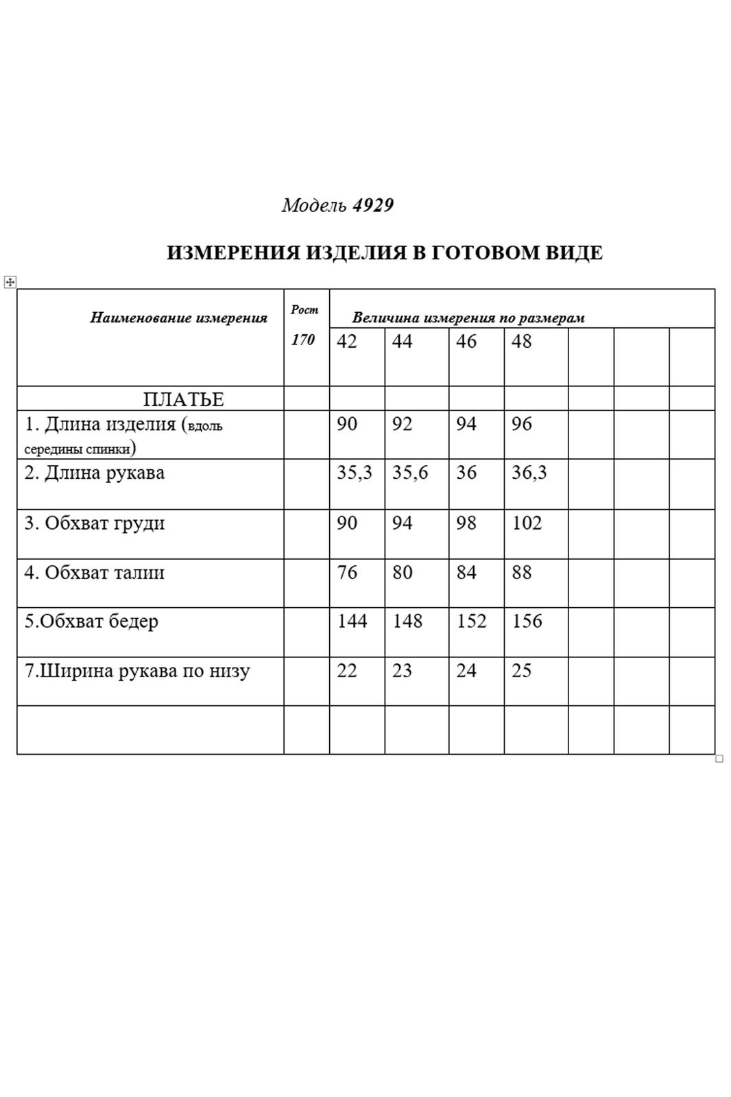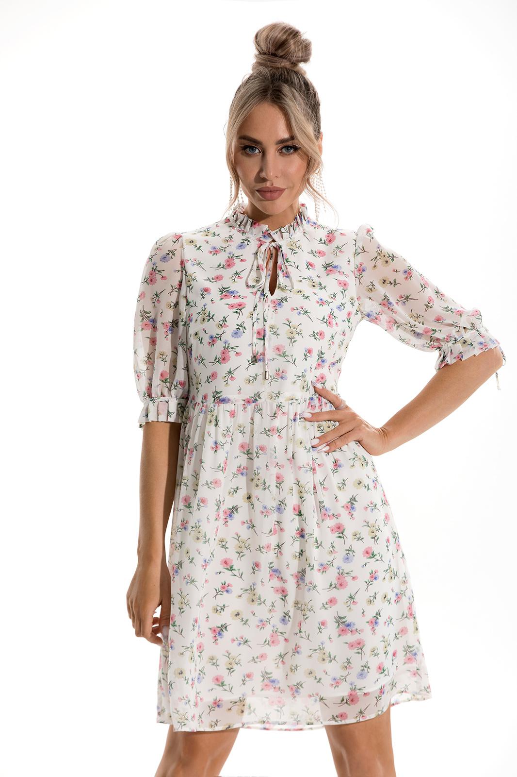 Платье прямого силуэта, свободной формы. Платье с отрезной стойкой, завязками, выходящими из стойки. Стойка заложена в мелкие складки. Платье отрезное на 4 см выше линии талии. Верхняя часть переда со средним швом, разрезом по верхней части шва. Верхняя часть спинки с талиевыми вытачками. Нижняя часть платья со сборкой по линии талии. Манжеты рукава заложены в мелкие складки, с завязками. Вид покроя рукава: втачной, 3/4. Цветовая гамма для верха, подкладки, фурнитуры, отделки: платье из ткани с цветочным рисунком. Платье на подкладке.