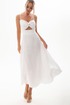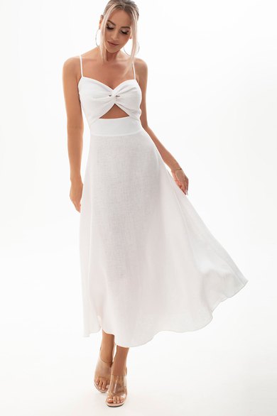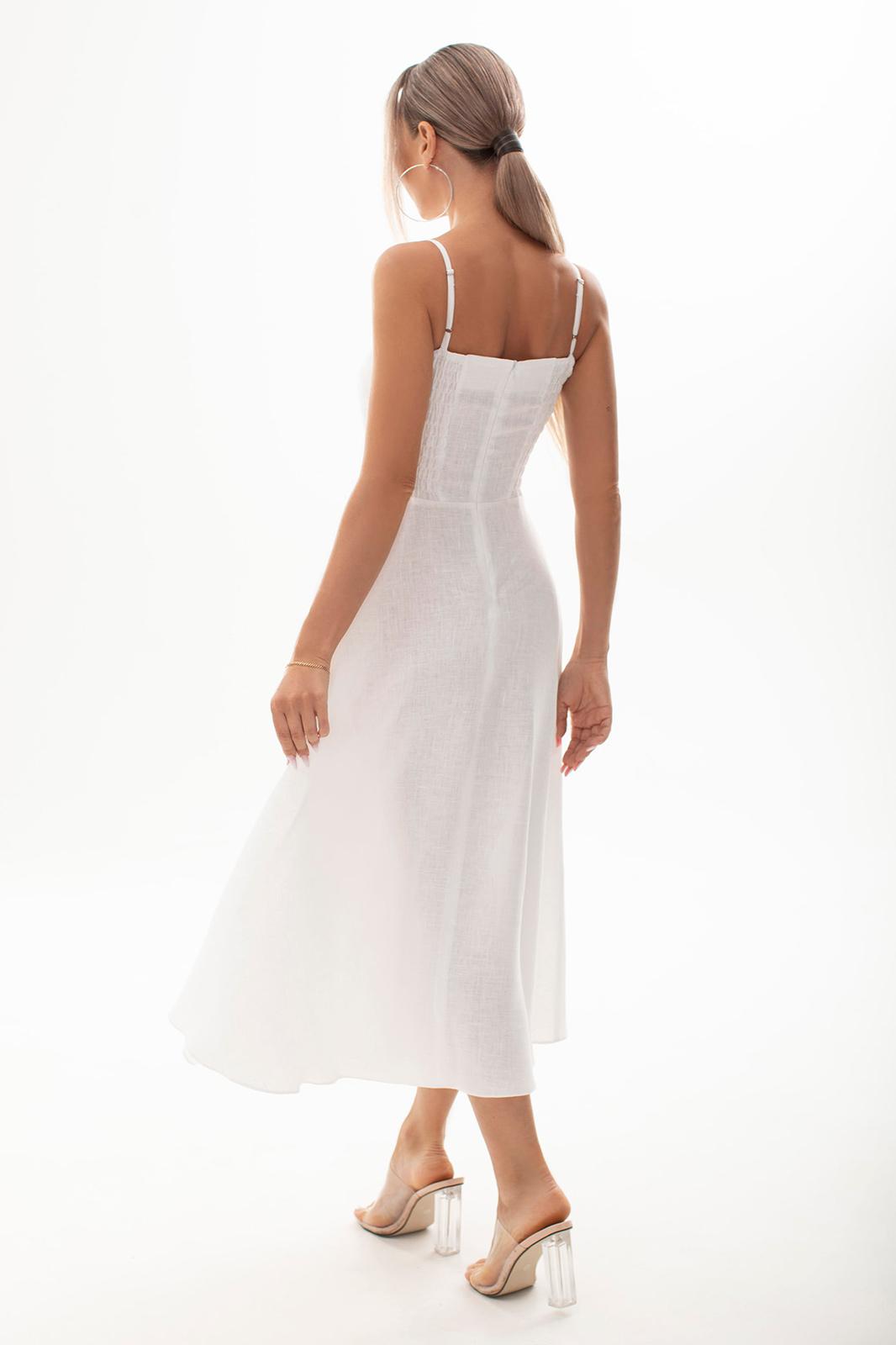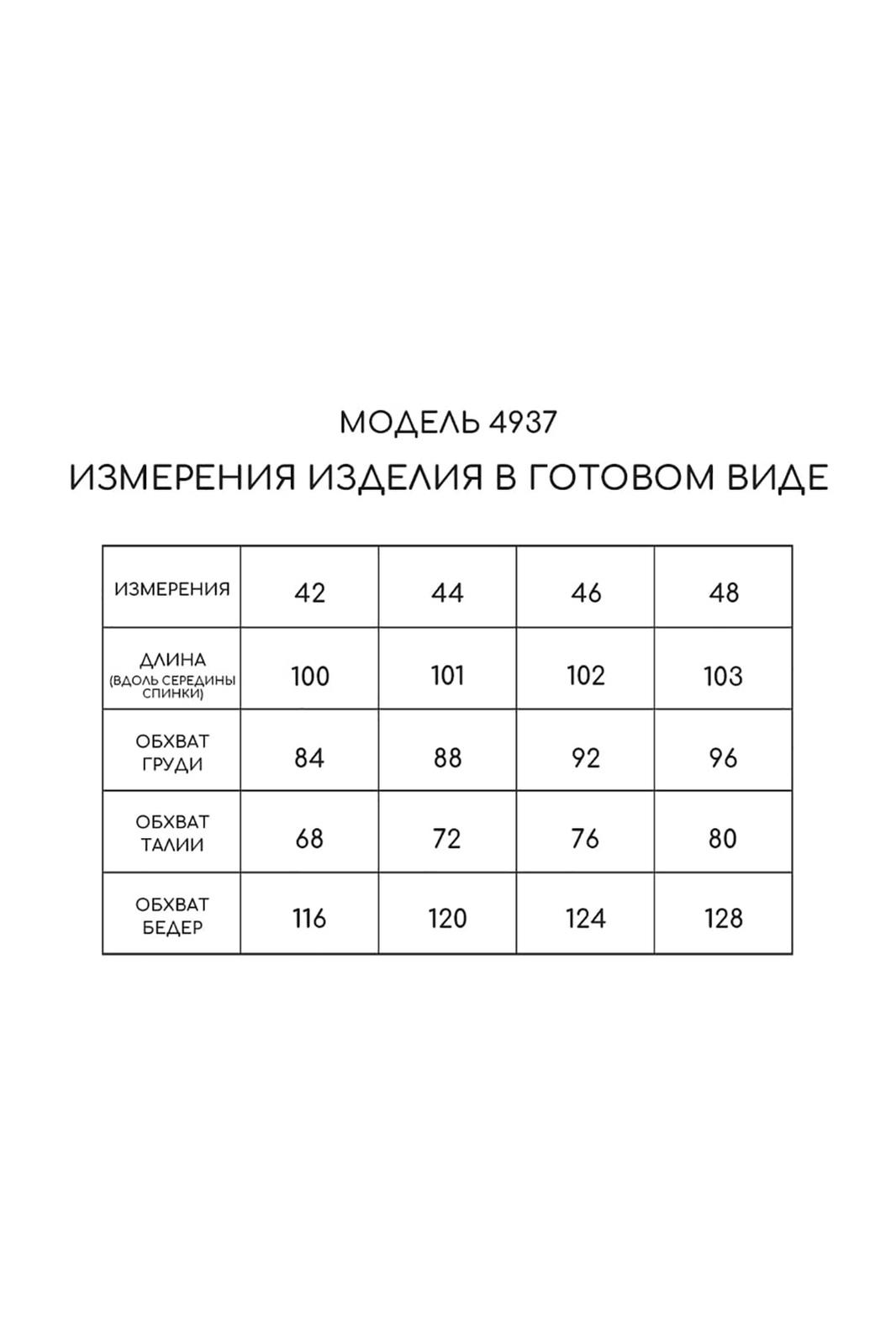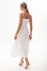 Платье на бретелях, без рукавов и воротника, с застежкой на потайную молнию в среднем шве спинки. Платье отрезное по линии талии. Лиф переда состоит из двух деталей, верхняя часть лифа с перекрученными деталями и отрезной нижней частью. Лиф спинки состоит из двух деталей, боковая деталь спинки присборена резинкой. Нижняя часть платья расклешенная.