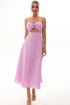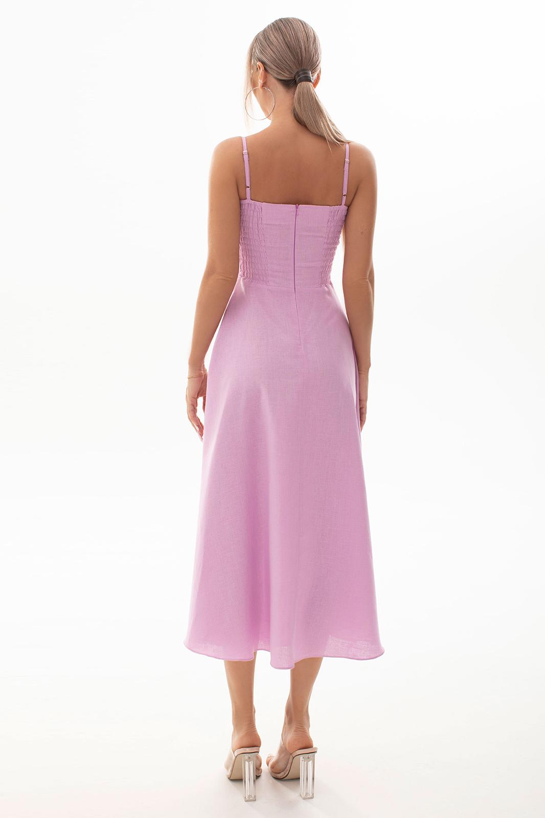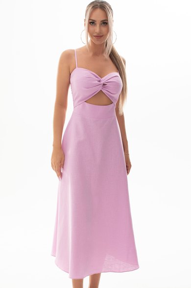 Платье на бретелях, без рукавов и воротника, с застежкой на потайную молнию в среднем шве спинки. Платье отрезное по линии талии. Лиф переда состоит из двух деталей, верхняя часть лифа с перекрученными деталями и отрезной нижней частью. Лиф спинки состоит из двух деталей, боковая деталь спинки присборена резинкой. Нижняя часть платья расклешенная.