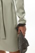 платье прямого силуэта без воротника с фигурной драпировкой по горловине переда. Перед с нагрудными вытачками. Спинка со средним швом, застежкой на потайную молнию в среднем шве спинки. Рукав втачной, длинный, со складками по окату. Платье со съемным поясом.